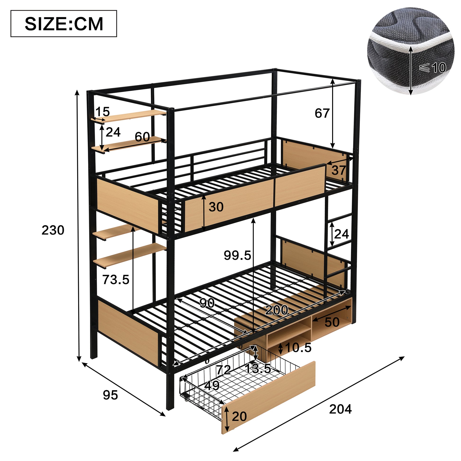 Matching Mattresses (Mattress Not Included): 90 x 200 cm (Mattress Thickness \<= 10 cm)