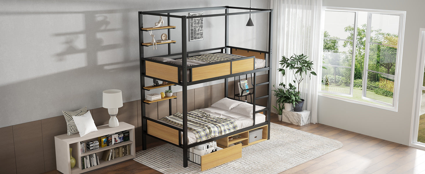 Bunk Bed, Iron & MDF, Double Shelf, Under Bed Storage, Black & Natural