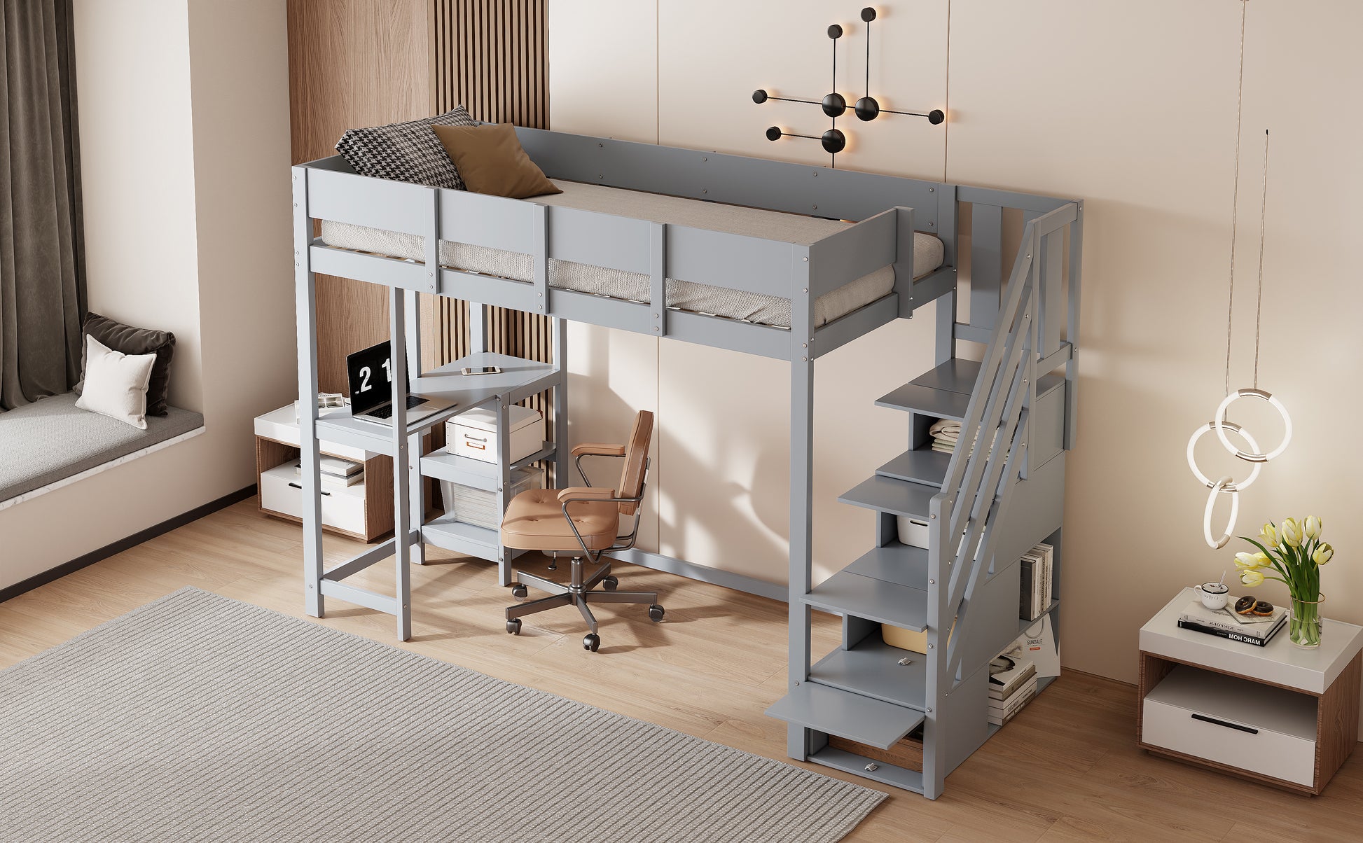 Bunk Bed, Multifunctional Loft with Storage & Shelf, Solid Pine Wood, Grey