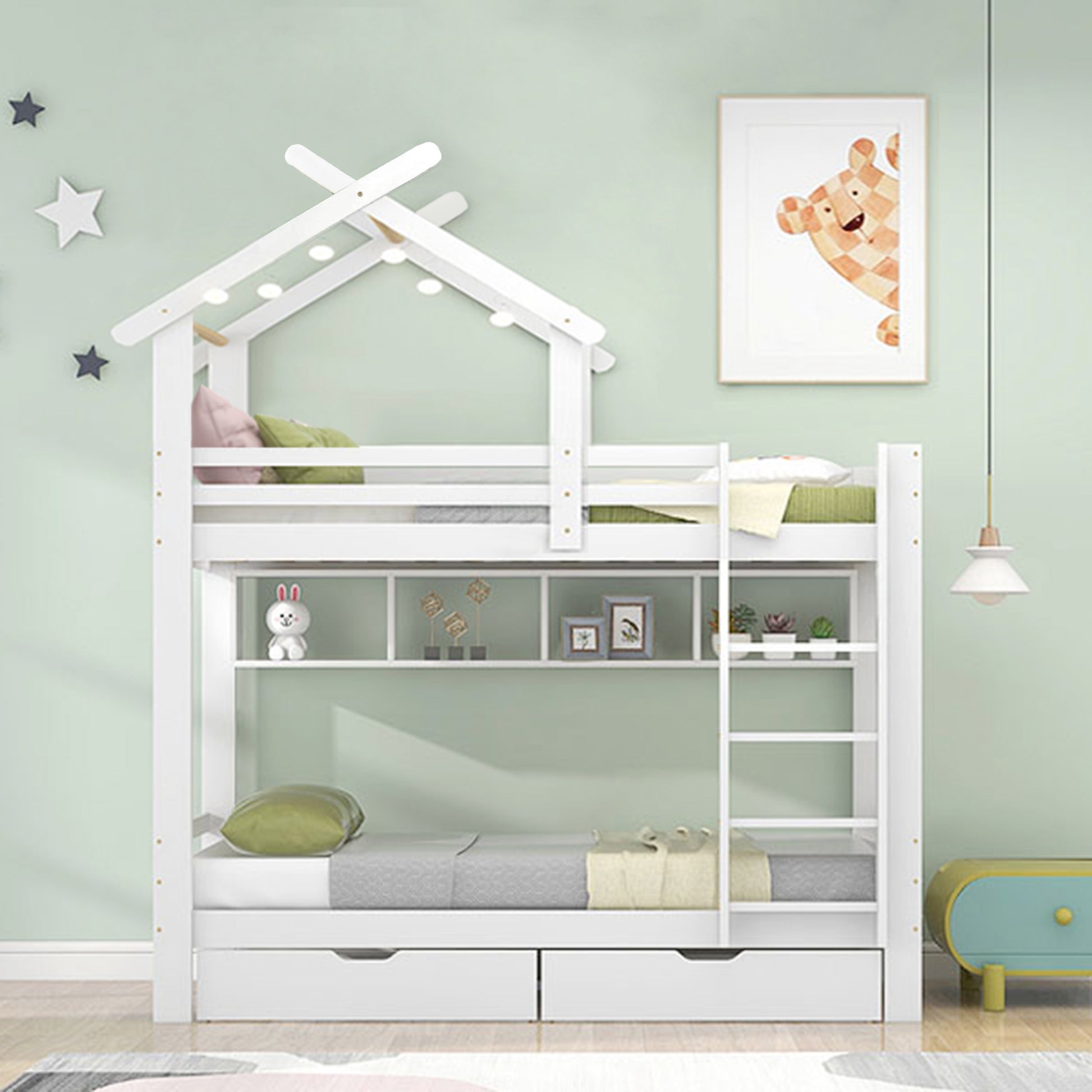 Bunk Bed with Drawers, Shelves & Ladder, Pinewood Frame, White