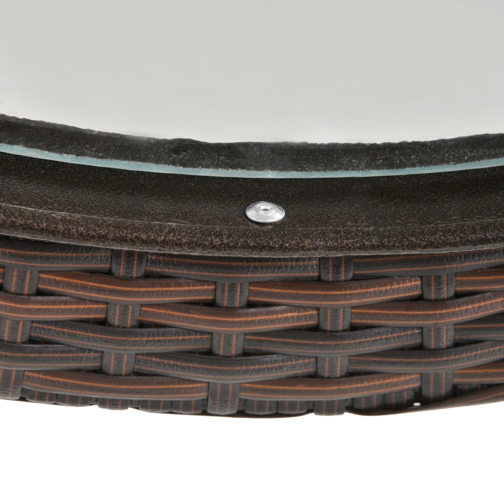 Crafted from high-quality materials, it features a rust-proof steel frame, a tempered glass tabletop, and a synthetic rattan weave, making it extremely durable and easy to maintain.