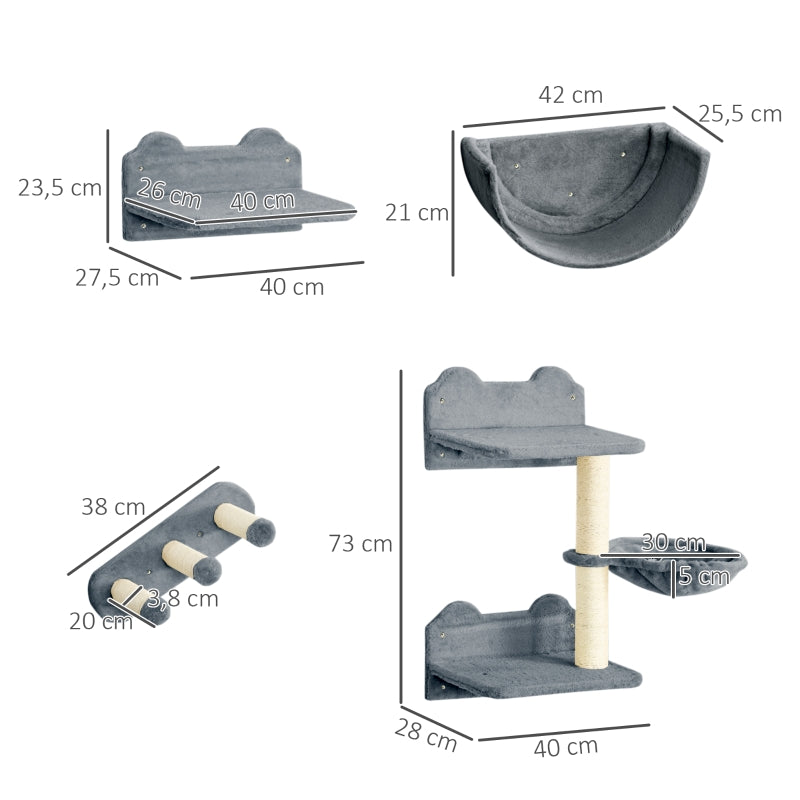Cat climbing wall specifications: Overall dimensions: 40L x 27.5W x 23.5H cm (single platform), 40L x 28W x 73H cm (3-level cat tree), 38L x 22W x 12H cm (stairs), and 42L x 25.5W x 21H cm (semi-circular platform). Suitable for cats under 5 kg. Assembly required.