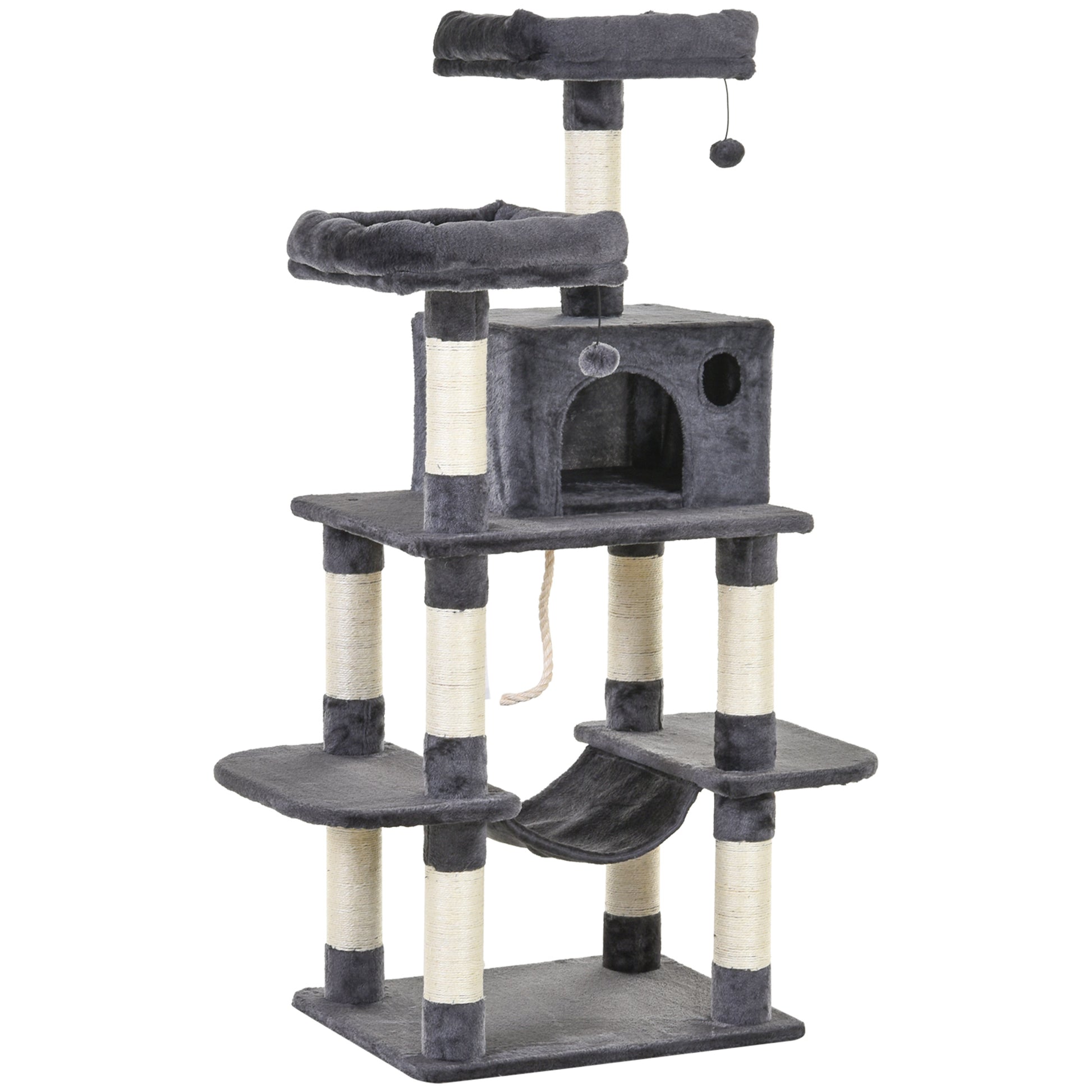 This cat tree features multiple platforms of varying heights and sizes, a spacious cave, and a hammock. A toy ball and a sisal rope add further variety.
