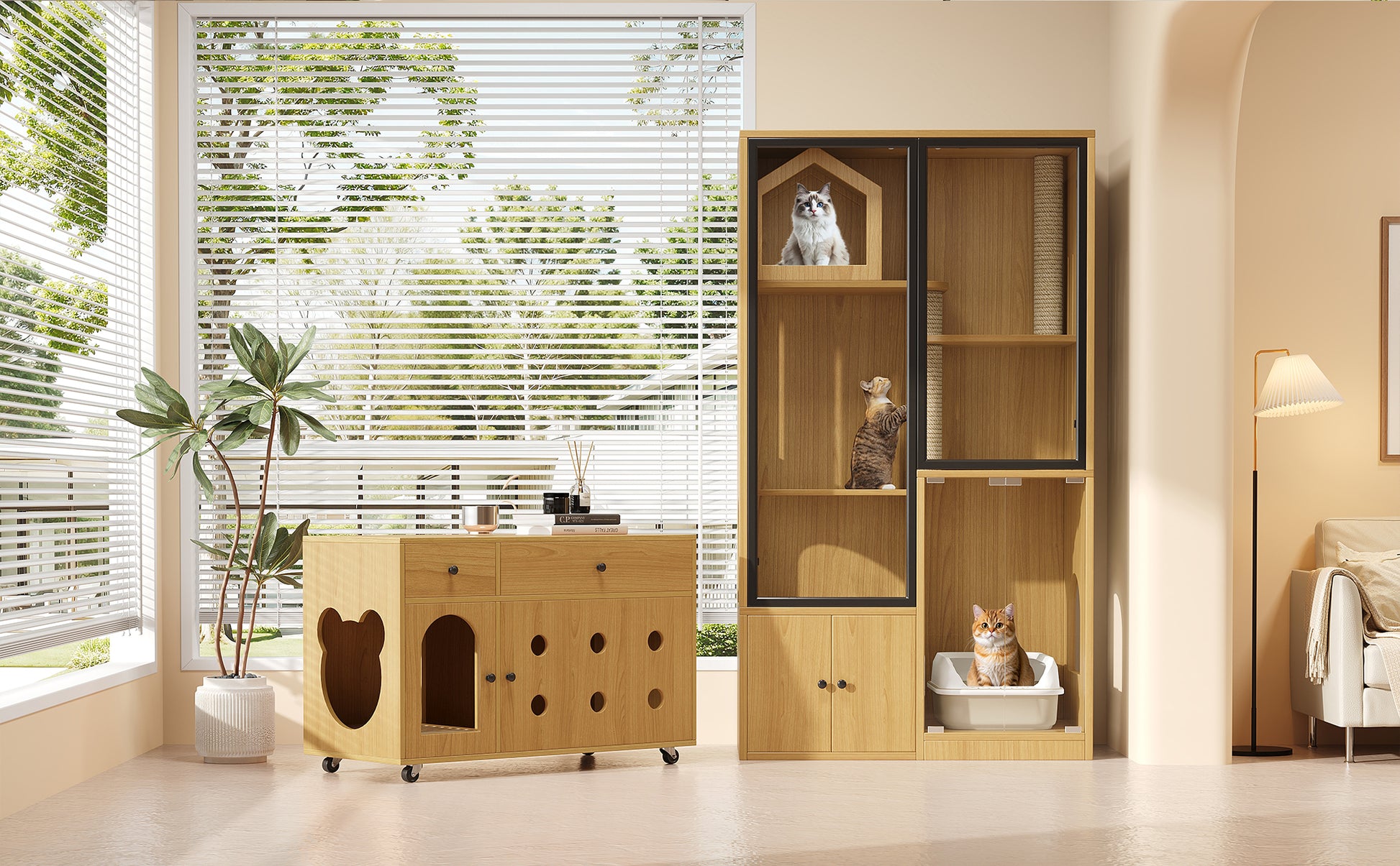 This combined unit features a separate Cat House and Litter Box Cabinet, creating a dedicated, odor-isolated space for your pets. The two zones can be flexibly combined or placed separately, making them suitable for any apartment.