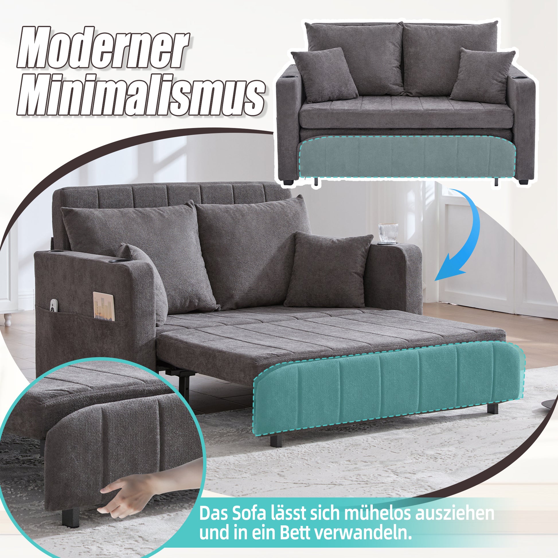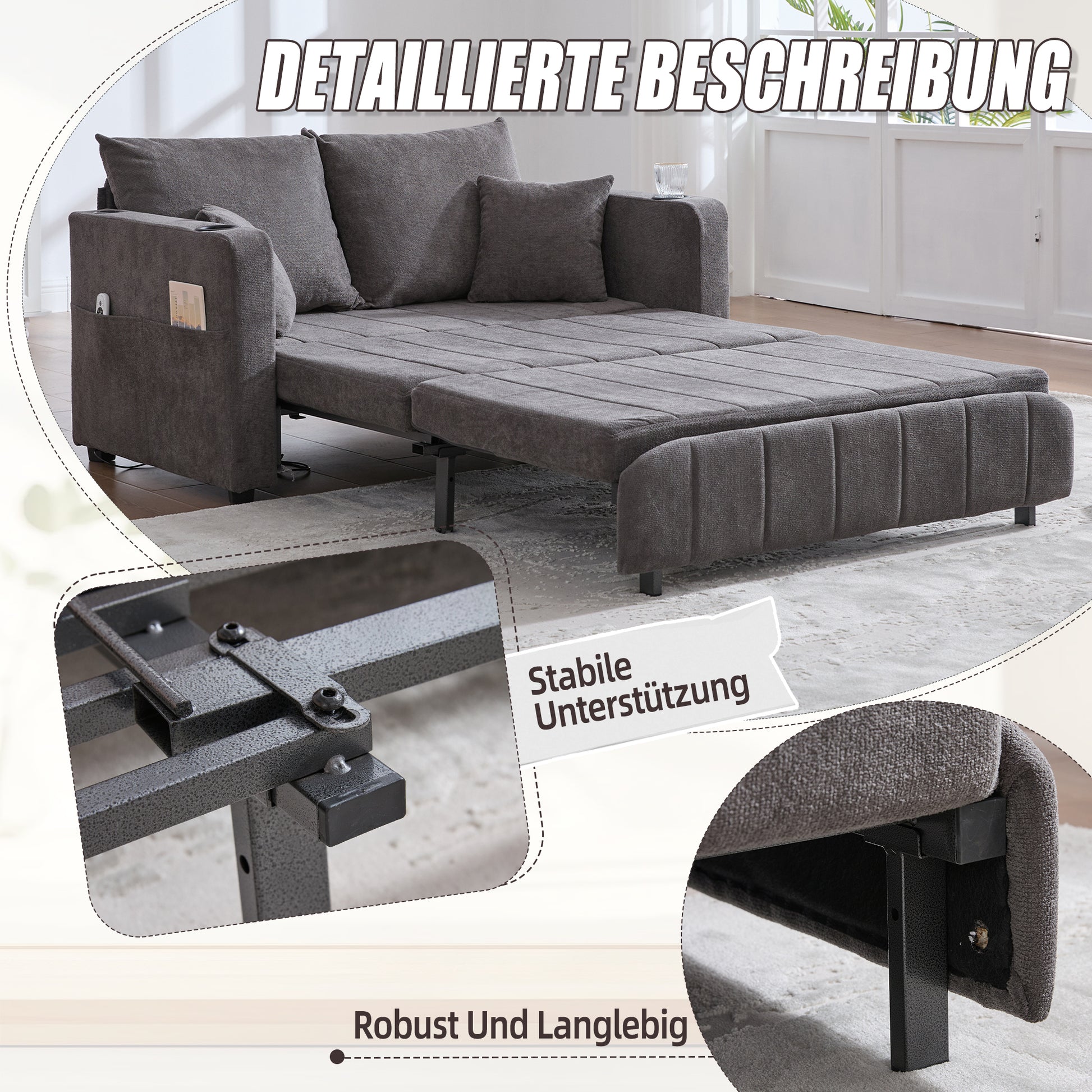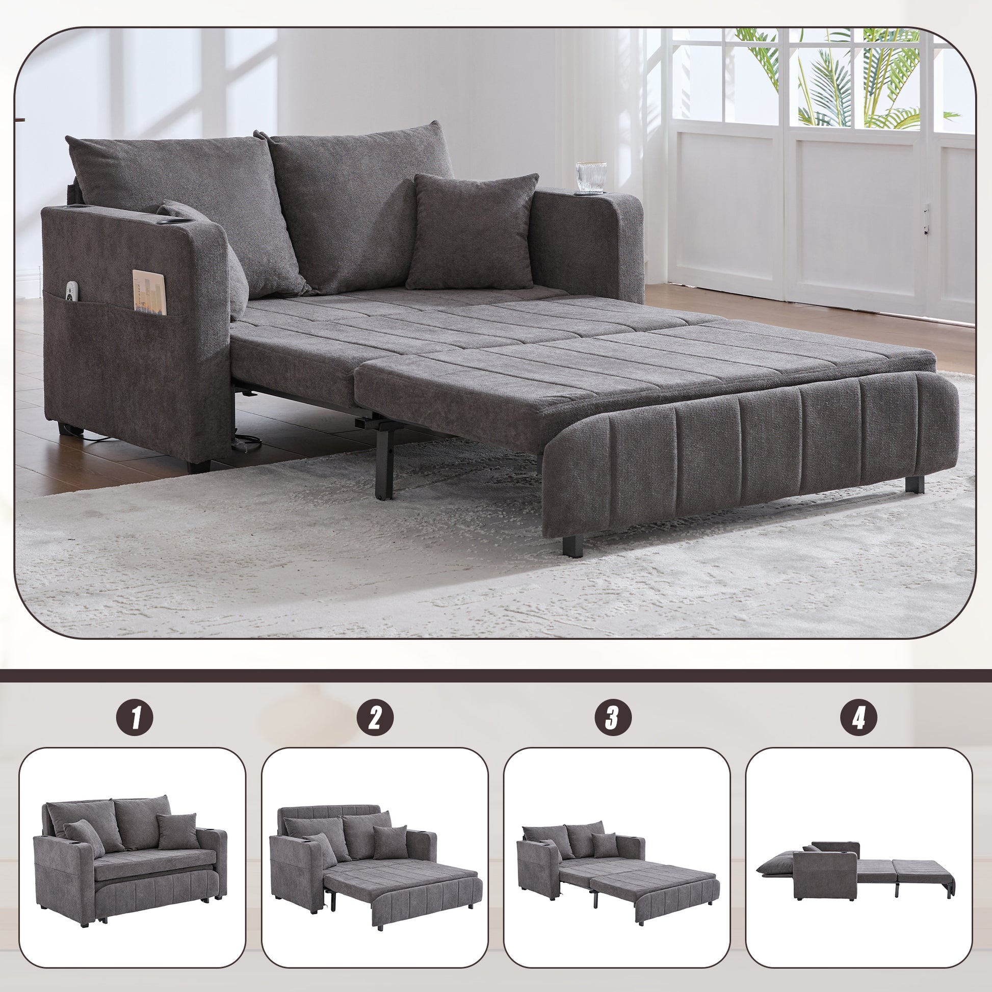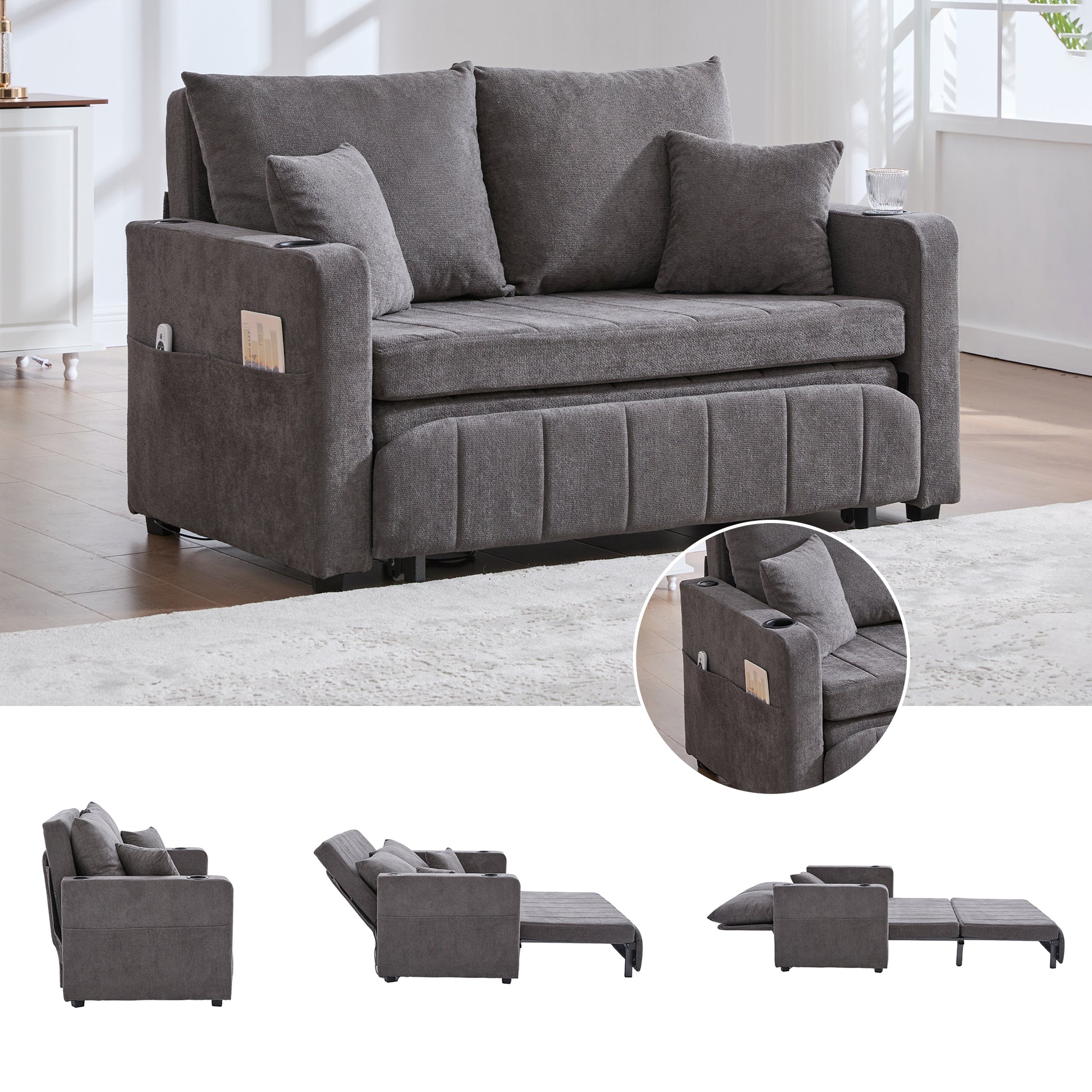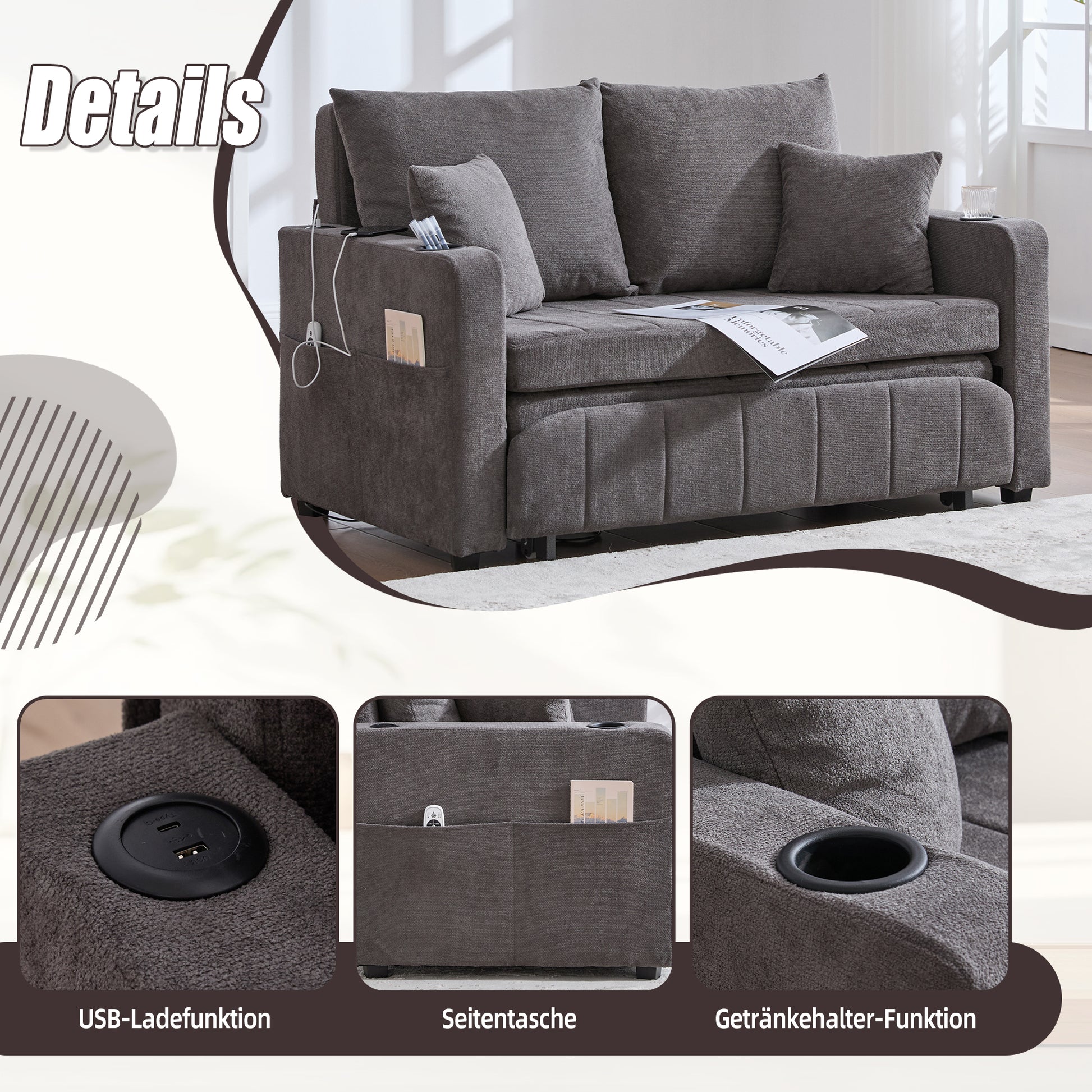 Chair, Multifunctional Folding Pull-Out Sofa with Storage, USB Charging, Cup Holder, Fabric