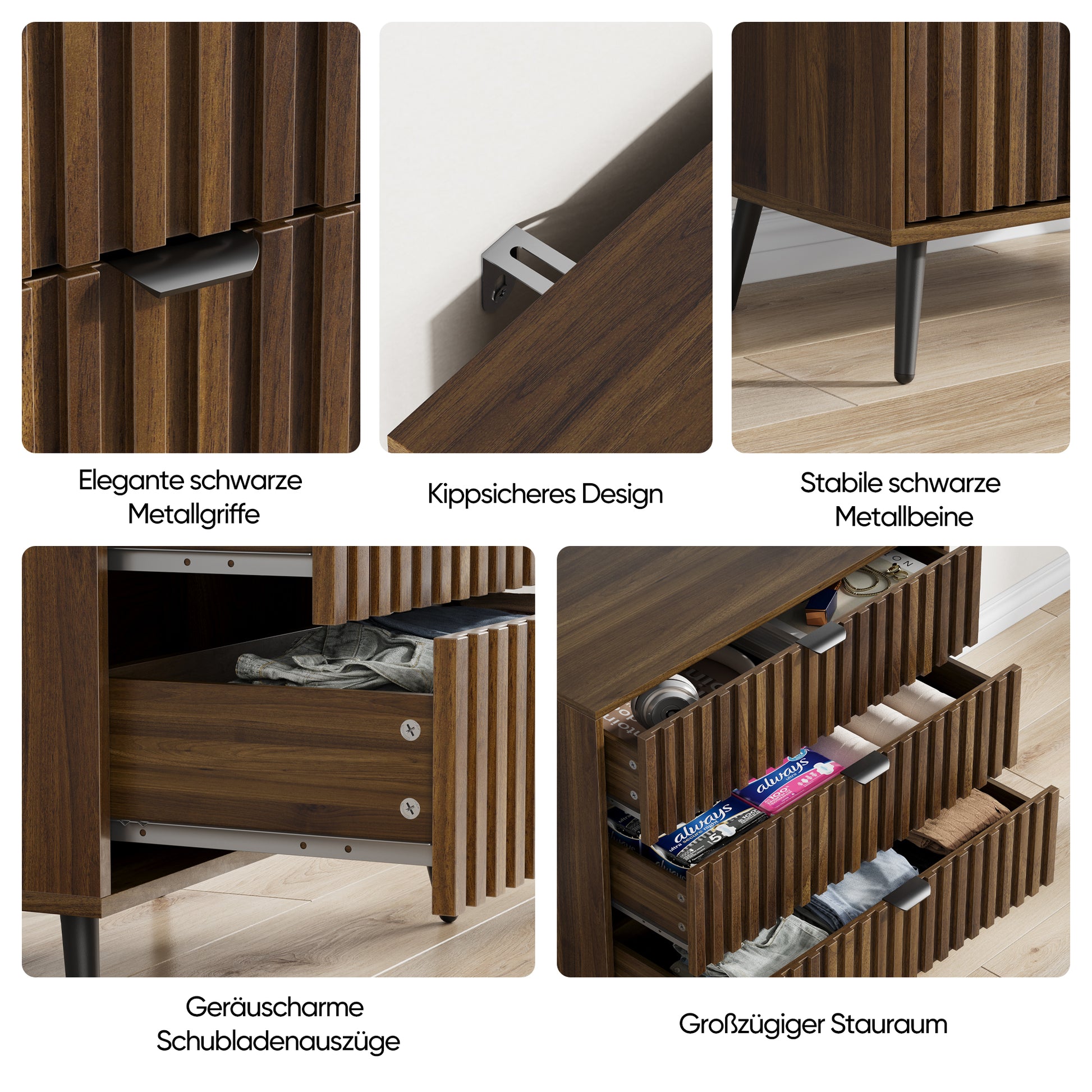 Traditional handles have been replaced with gold-colored metal handles, giving the chest a stylish and understated look. These handles allow for smooth opening and closing. Each drawer is also equipped with metal runners on both sides, ensuring quiet and trouble-free operation.