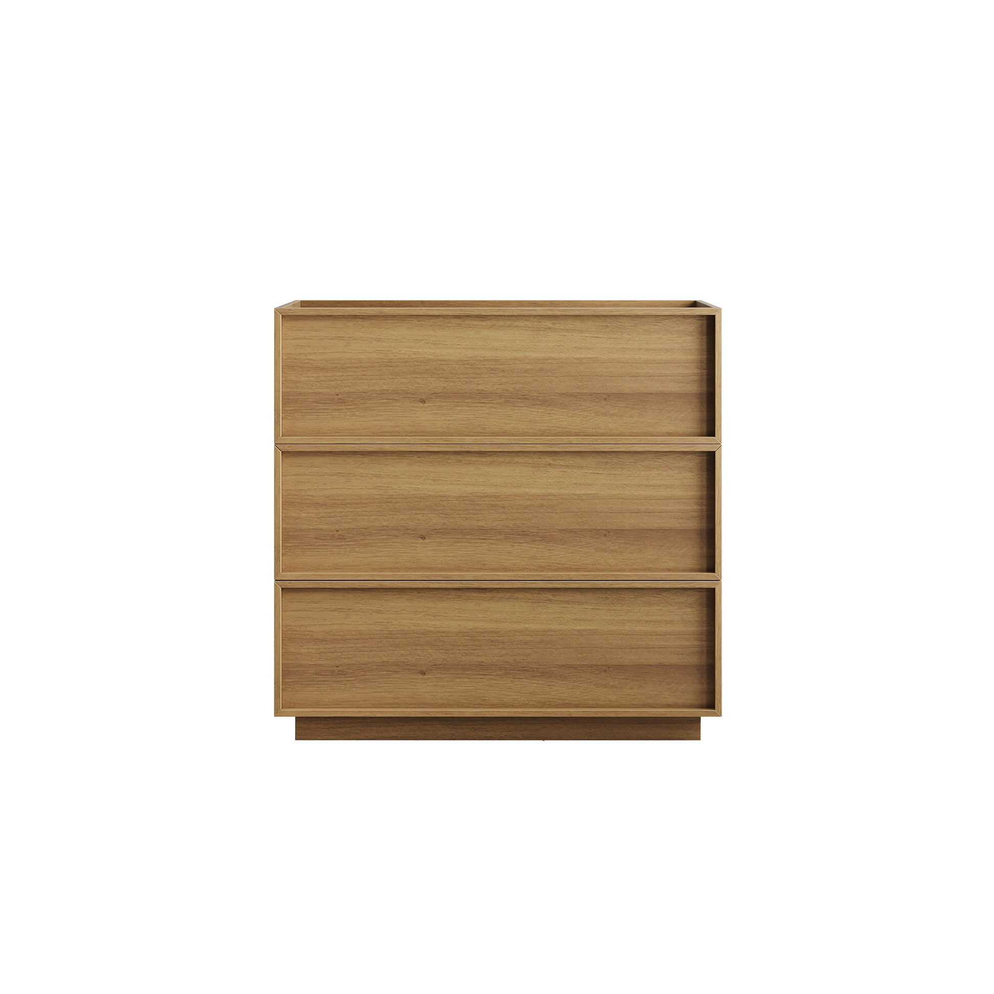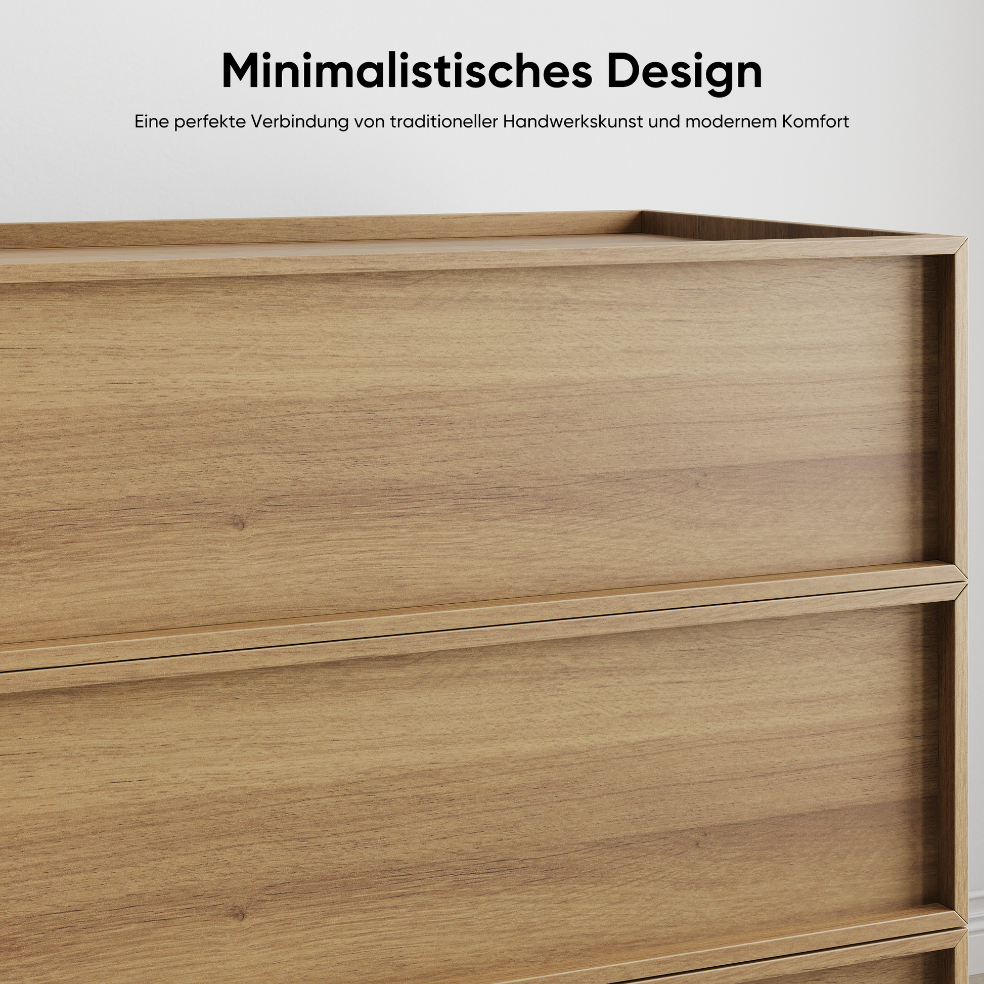 This chest of drawers impresses with its unique design and exquisite craftsmanship. The natural oak finish and the minimalist design of the handle-free drawers, combined with practical storage space, create an individual piece of furniture that blends modern elements with elegance. This chest of drawers will become a focal point in your home and effortlessly complements various interior design styles.