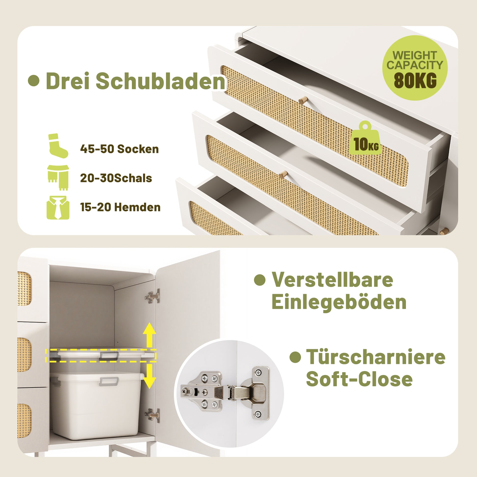 Chest of Drawers with Rattan & Gold Handles, 3 Drawers 1 Door, White Country Style