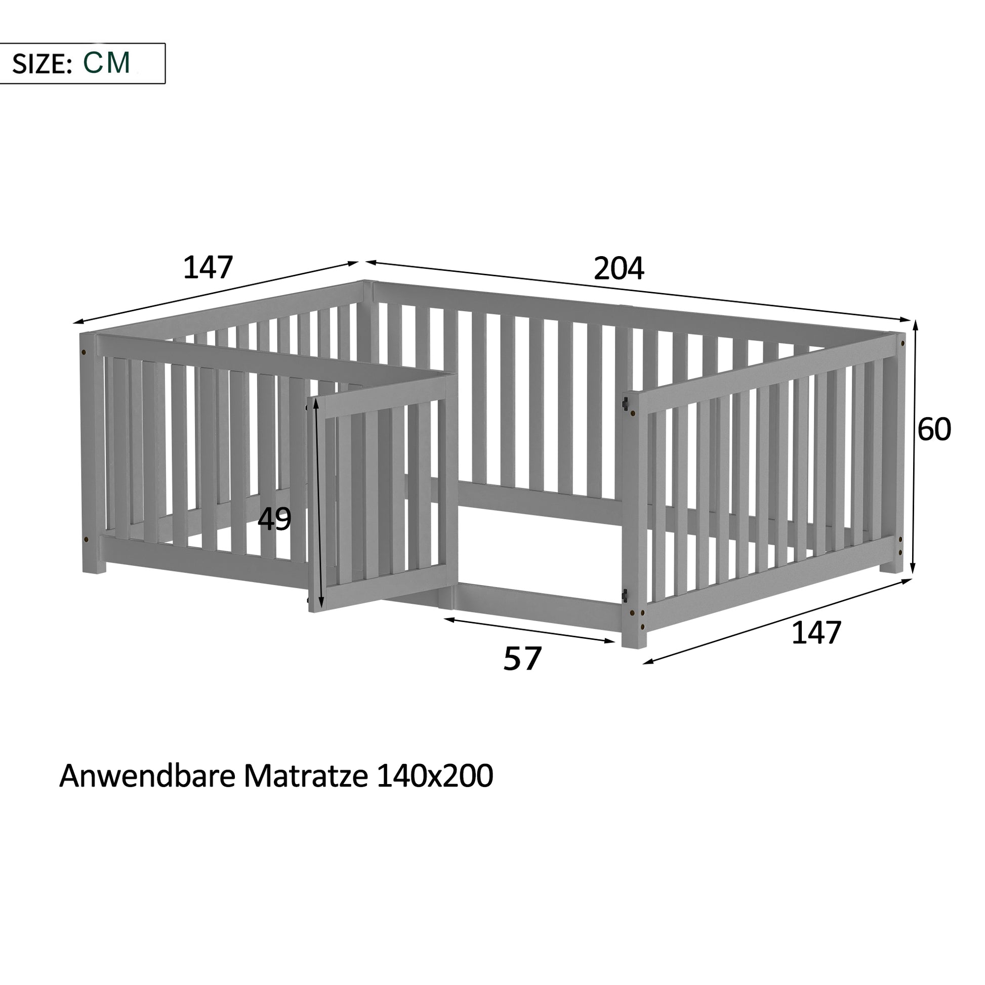 Children's bed 140 x 200, wooden floor bed frame with fence and door, grey