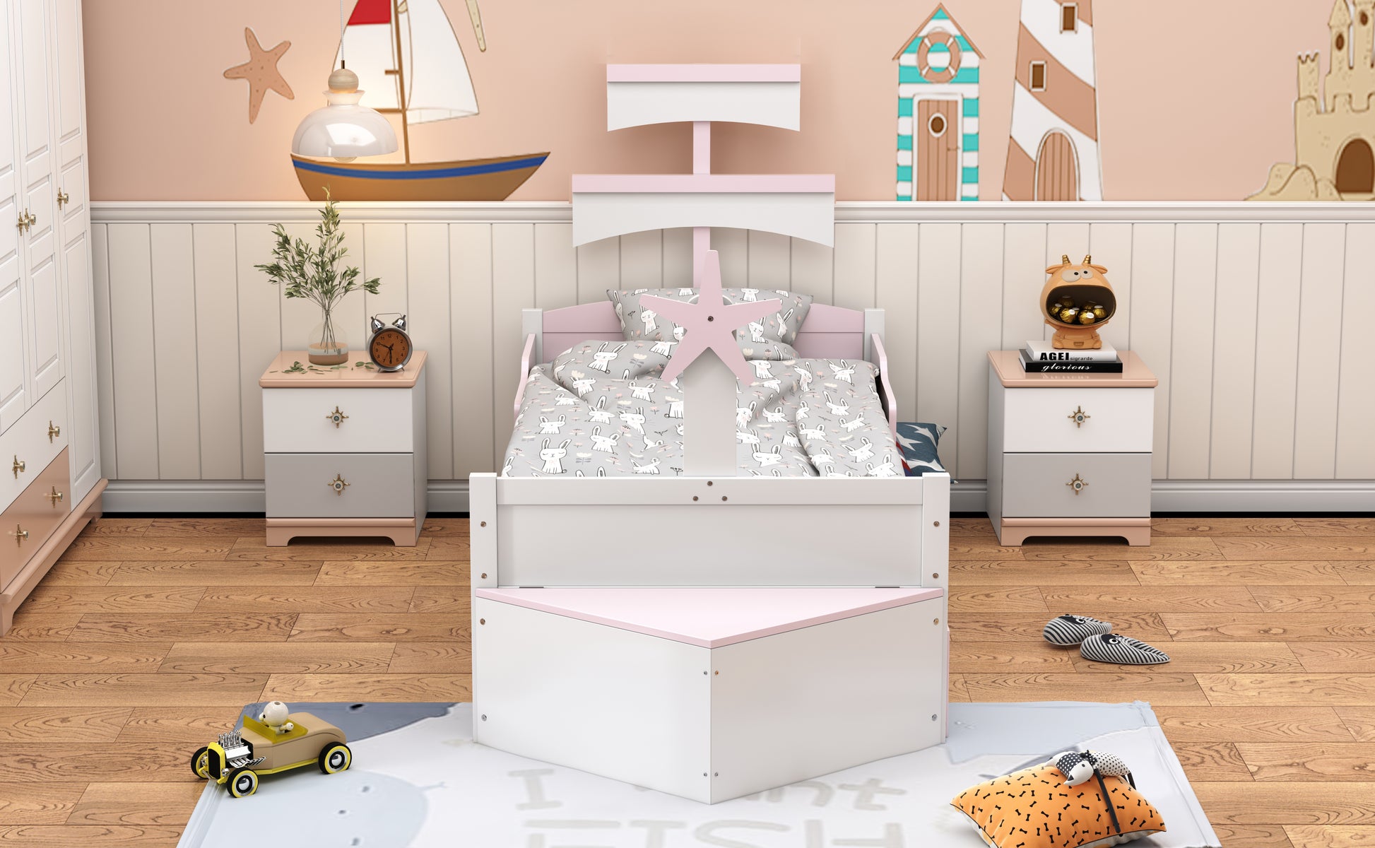 Children's Bed 90*200, Sailboat Shape with Pull-Out Bed & Storage, Pink Wood