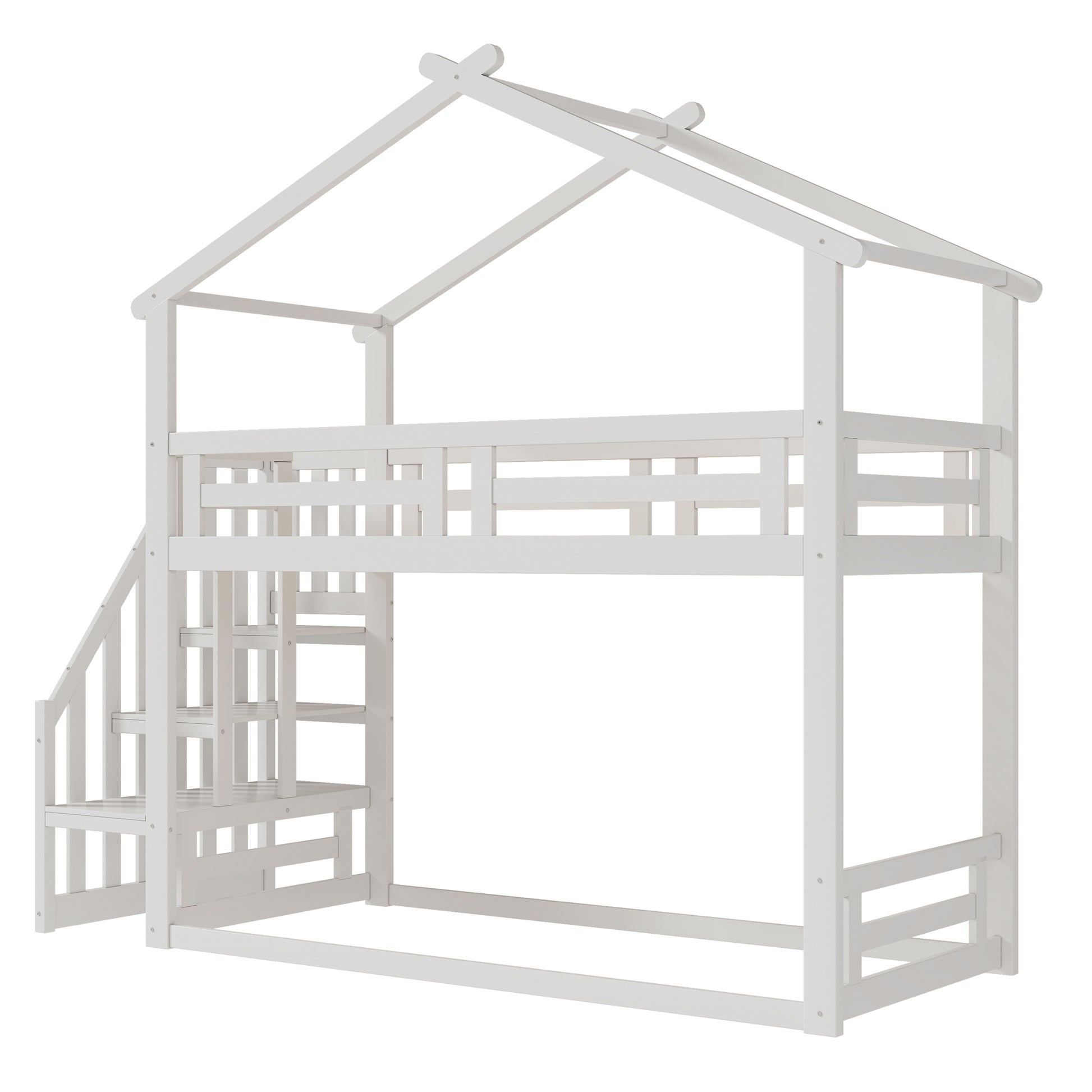 Children's Bed 90x200cm, Low Bunk Bed with Safety Stairs, Solid Wood, White