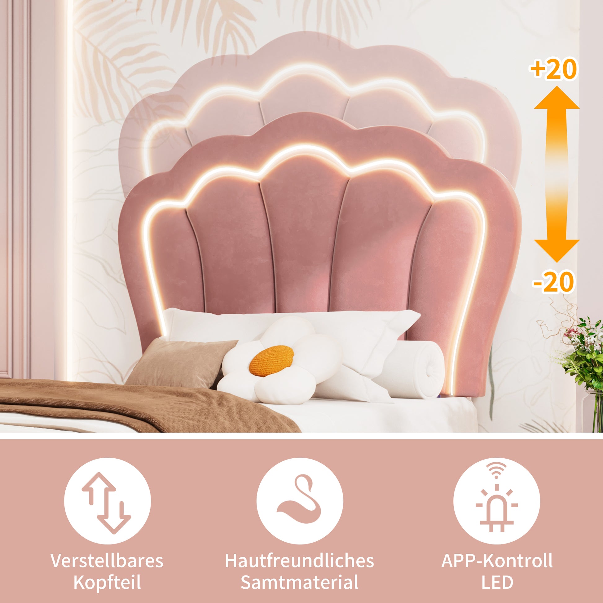 Children's Bed, LED Single with Drawers, APP-Control, Adjustable Headboard, Velvet Pink