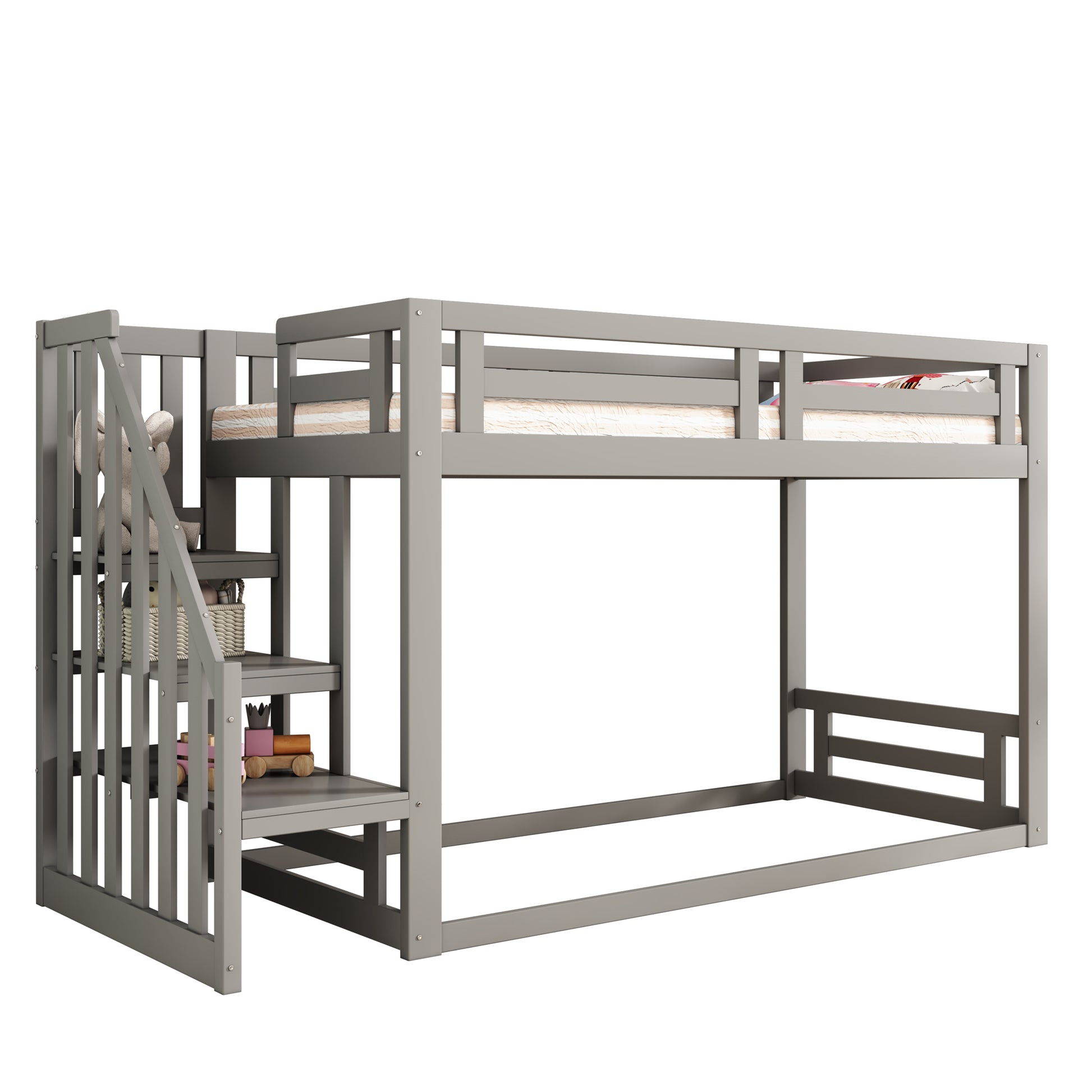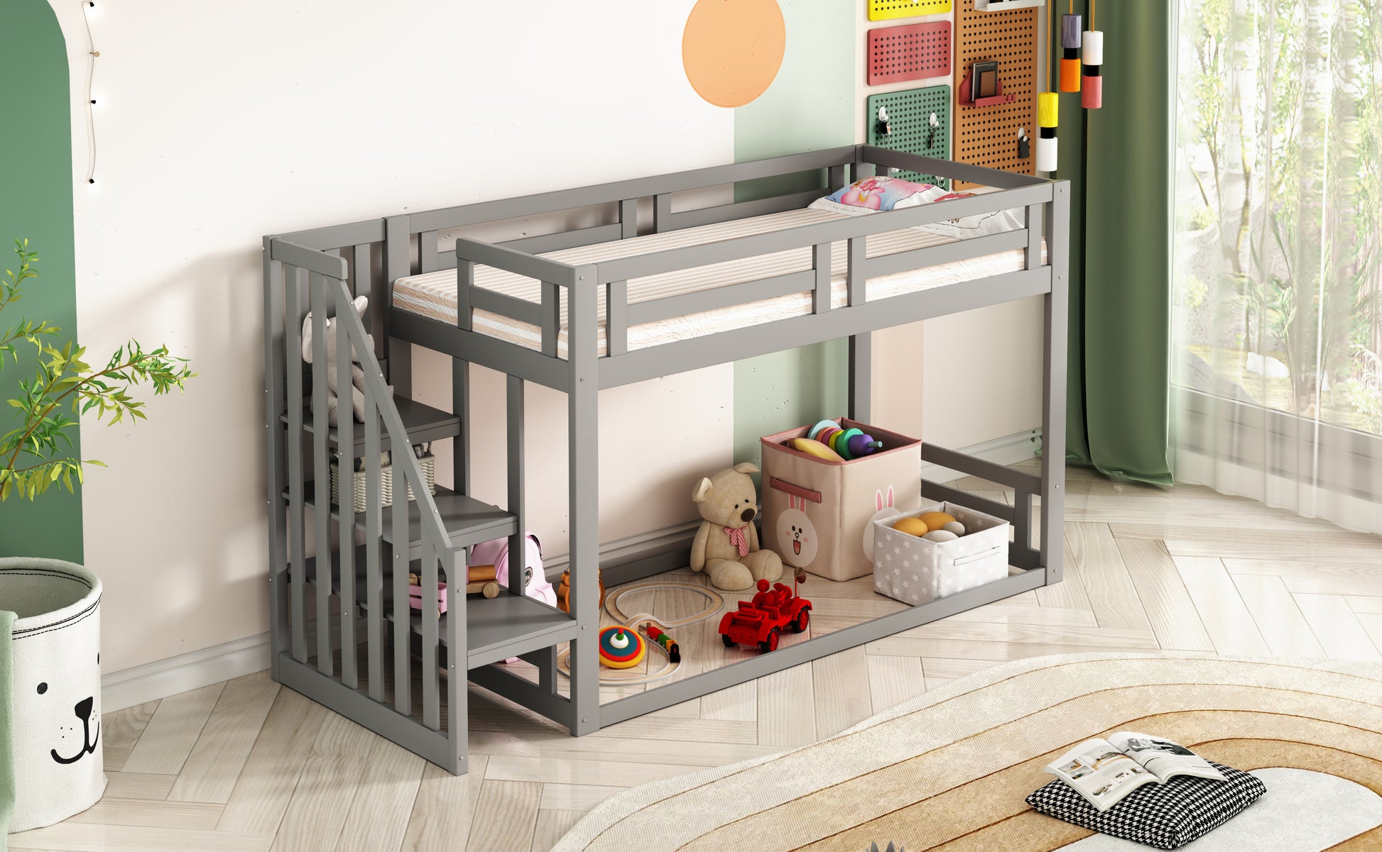 Children's Bed, Low Bunk with Safety Stairs, Solid Wood Gray