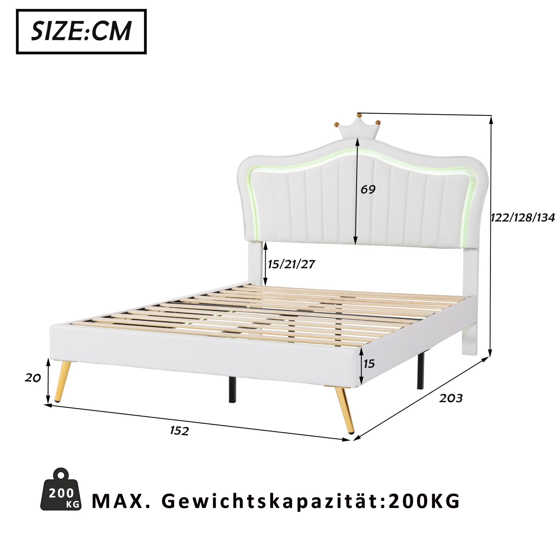 Children's Bed Upholstered, 140x200cm Crown Double with LED Lights, White PU Leather