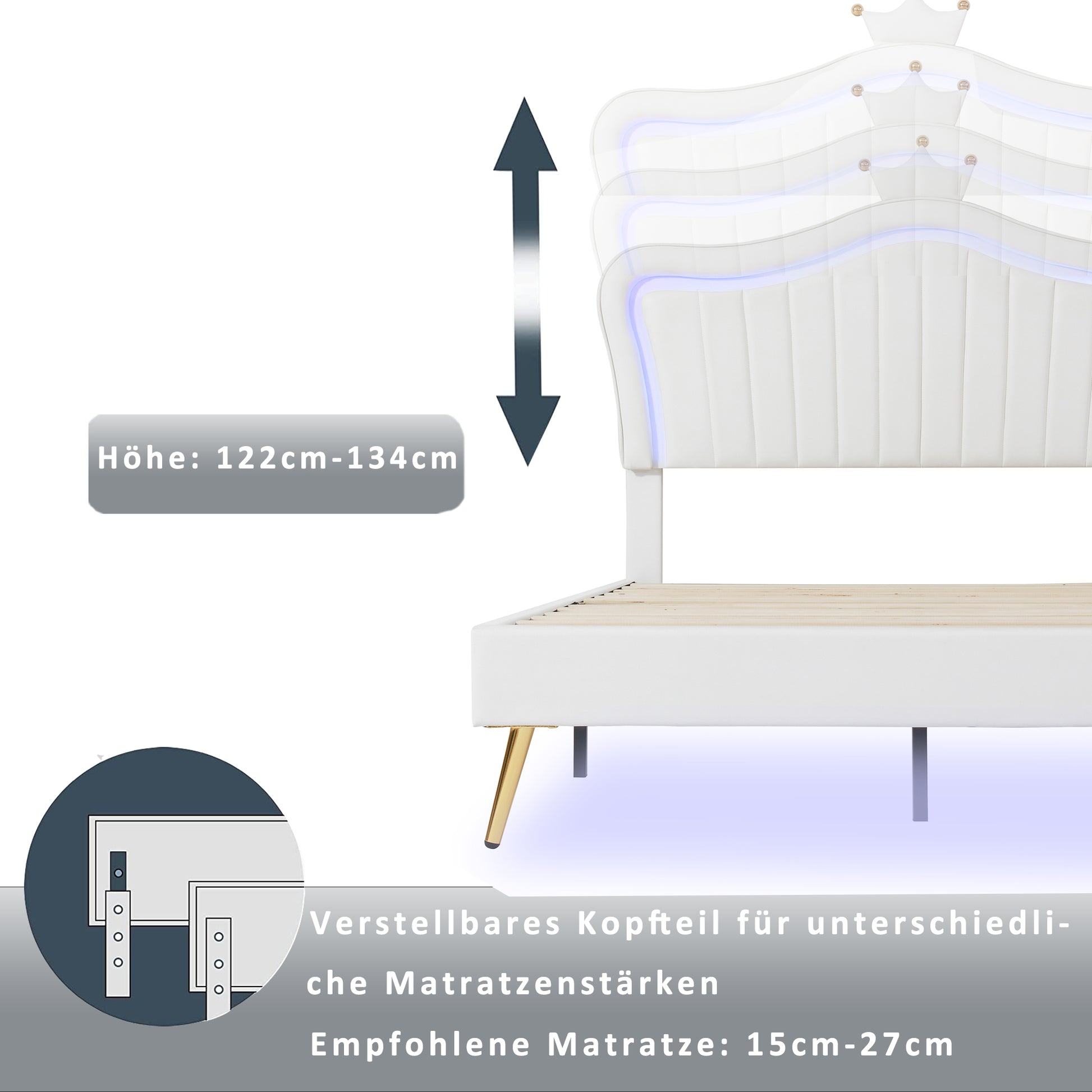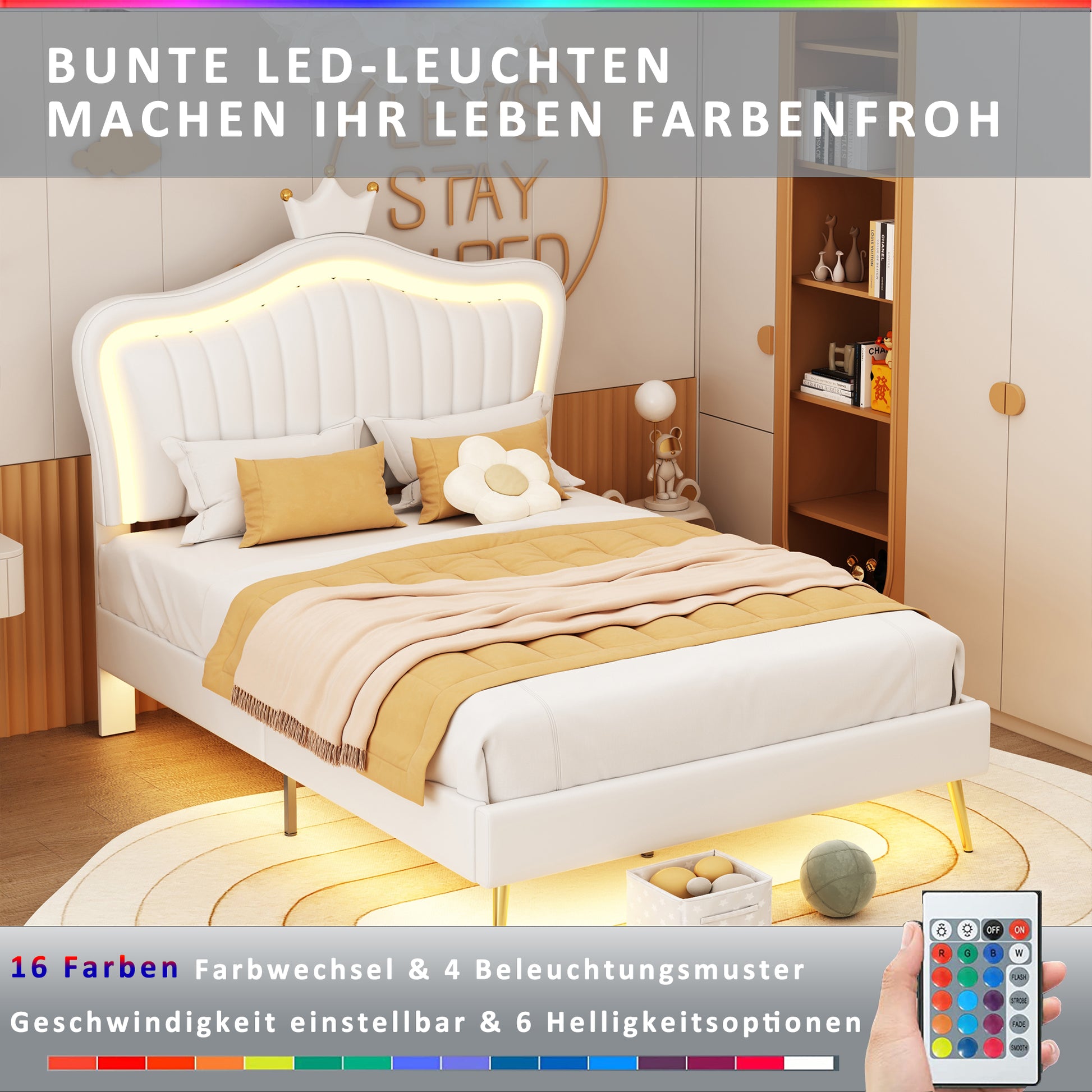 Children's Bed Upholstered, 90x200cm Crown Double Bed Frame with LED Lights, White PU Leather