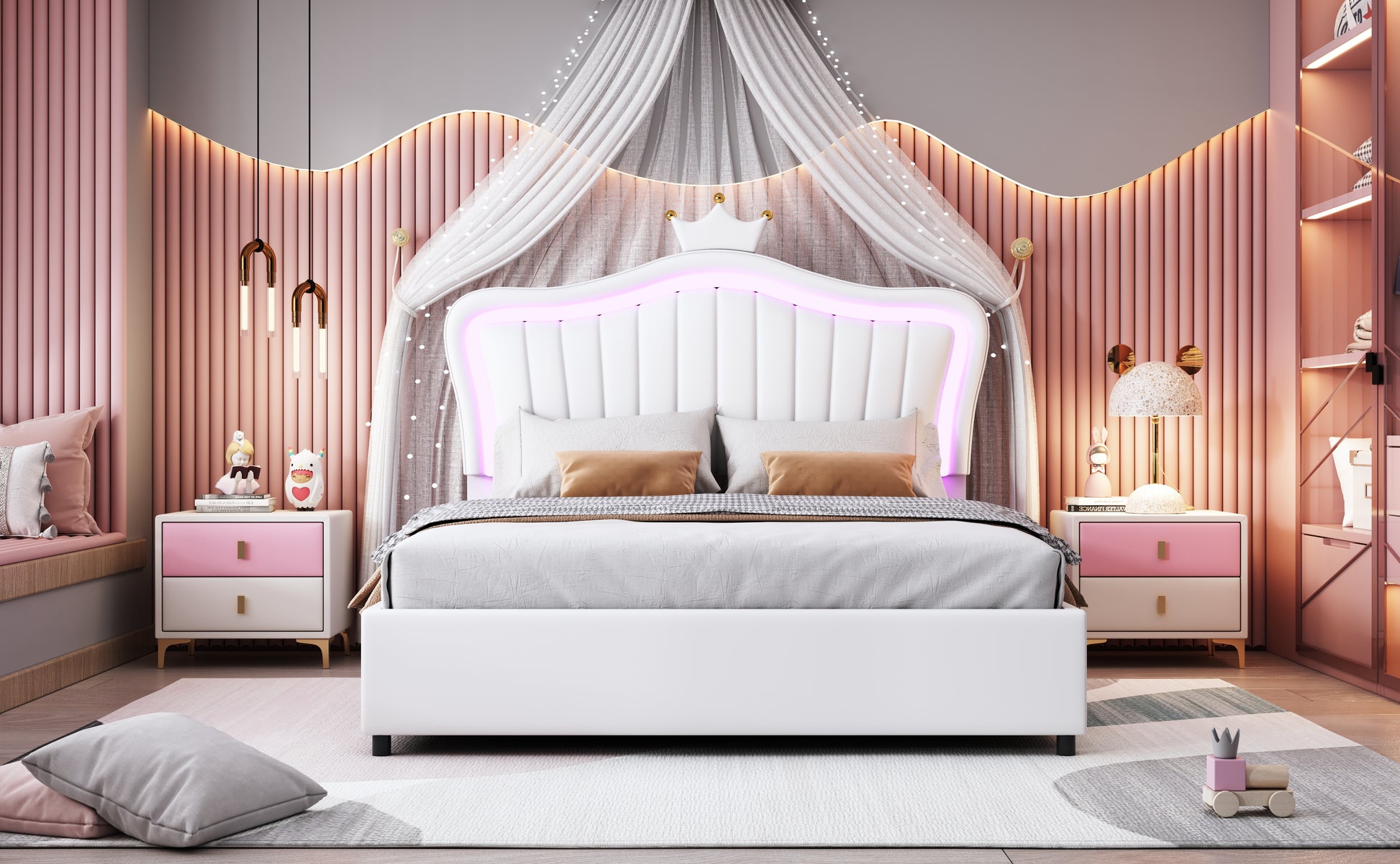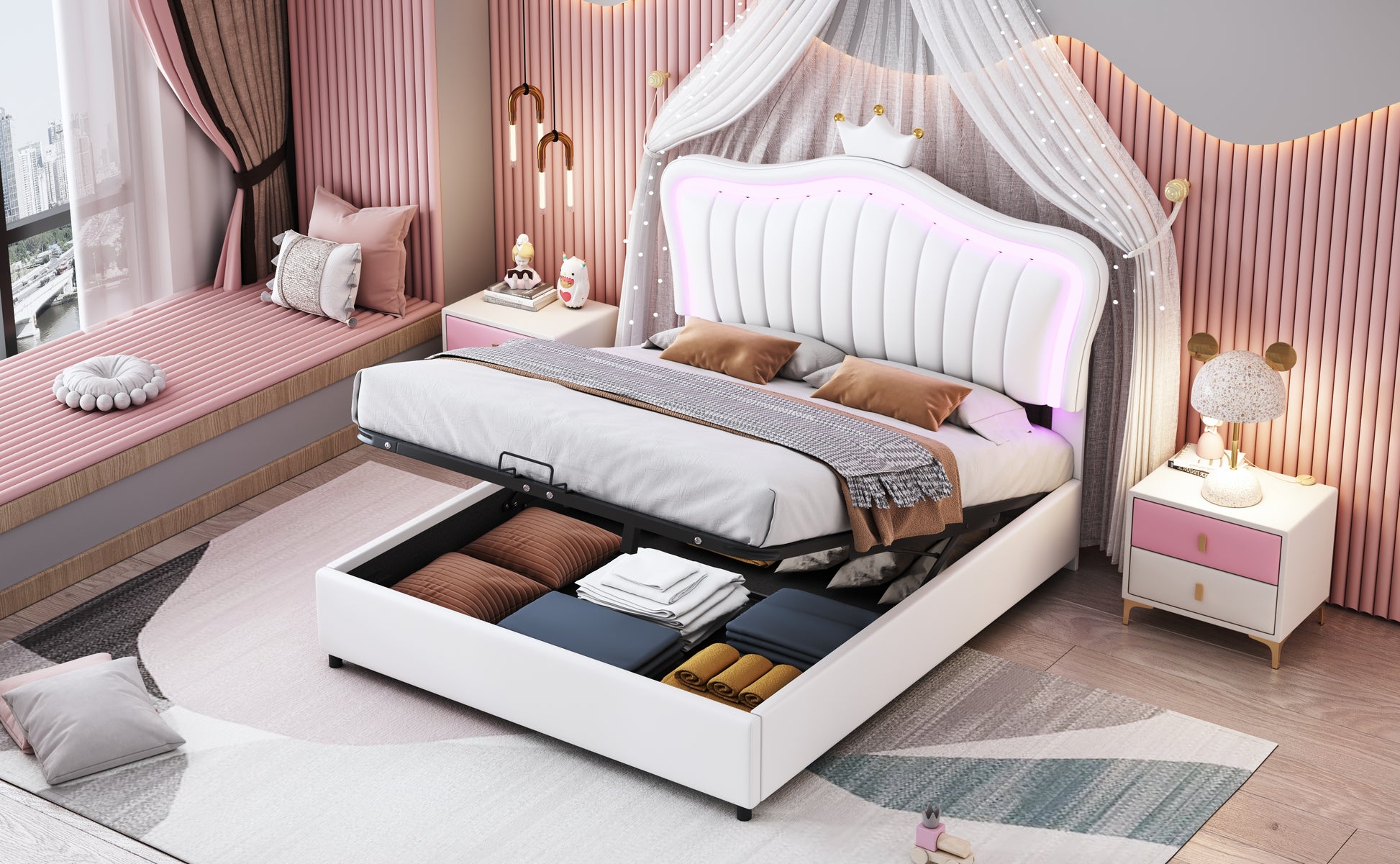 Children's Bed, Upholstered Hydraulic Storage with LED Lights, White PU Leather