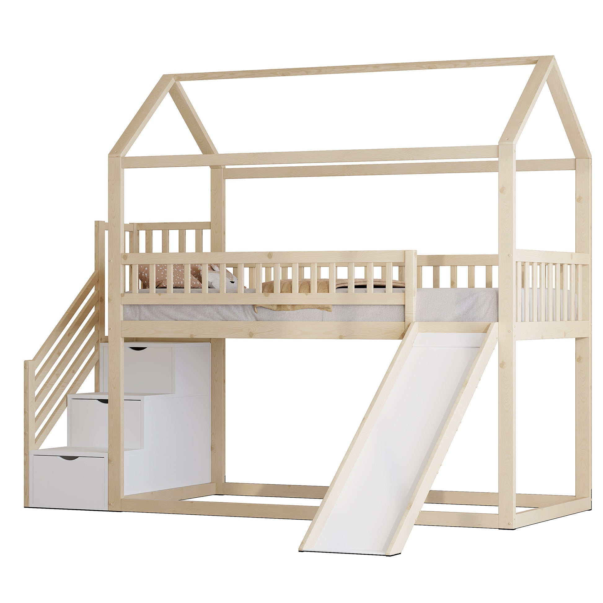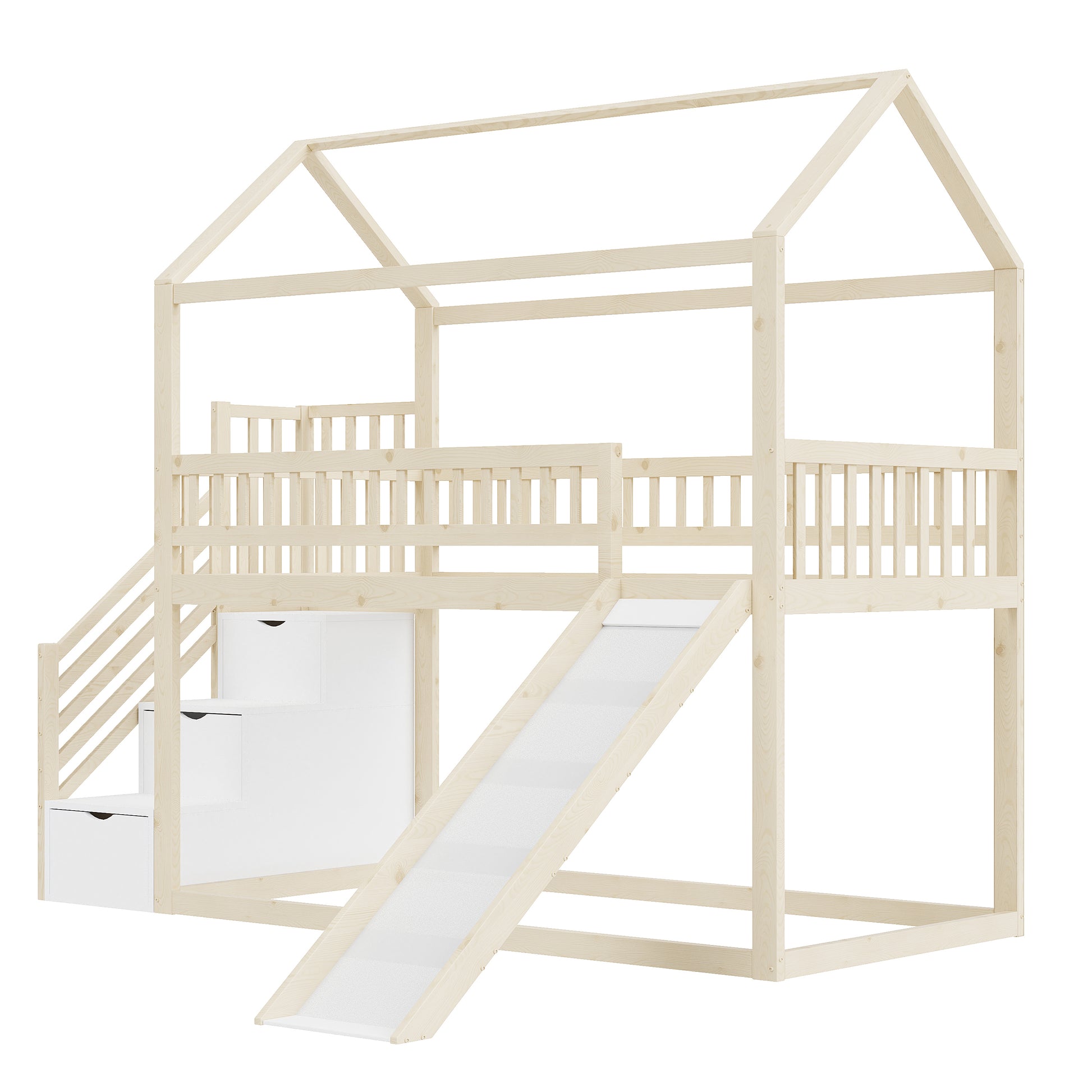 Children's Bunk Bed 90x200cm, Loft with Slide & Storage Ladder, Solid Wood