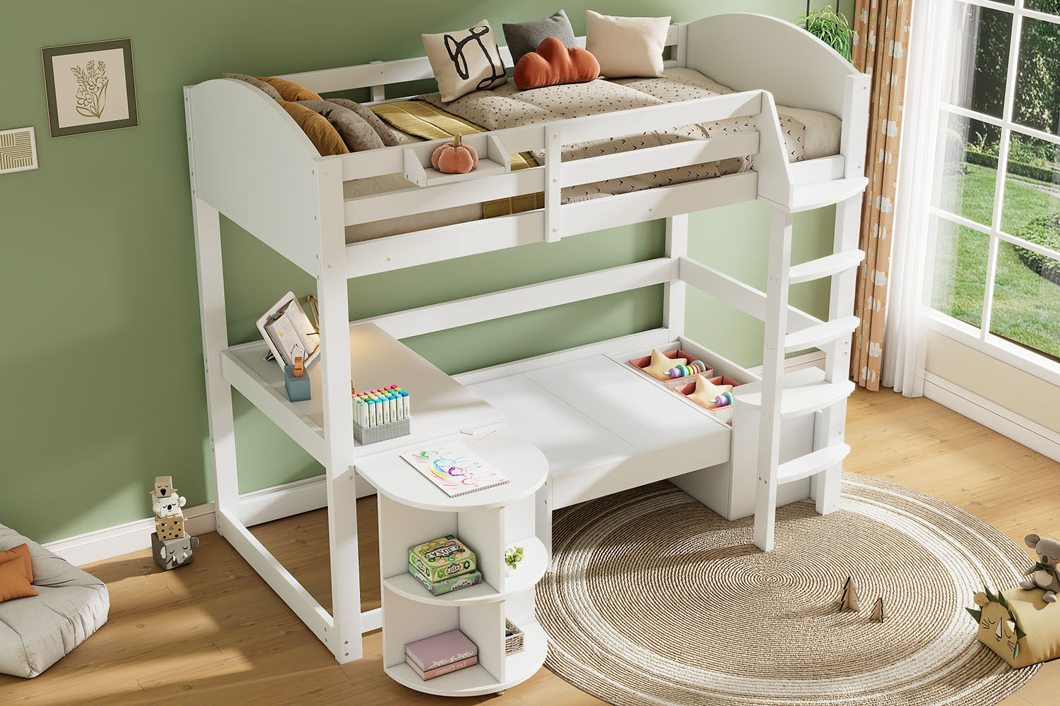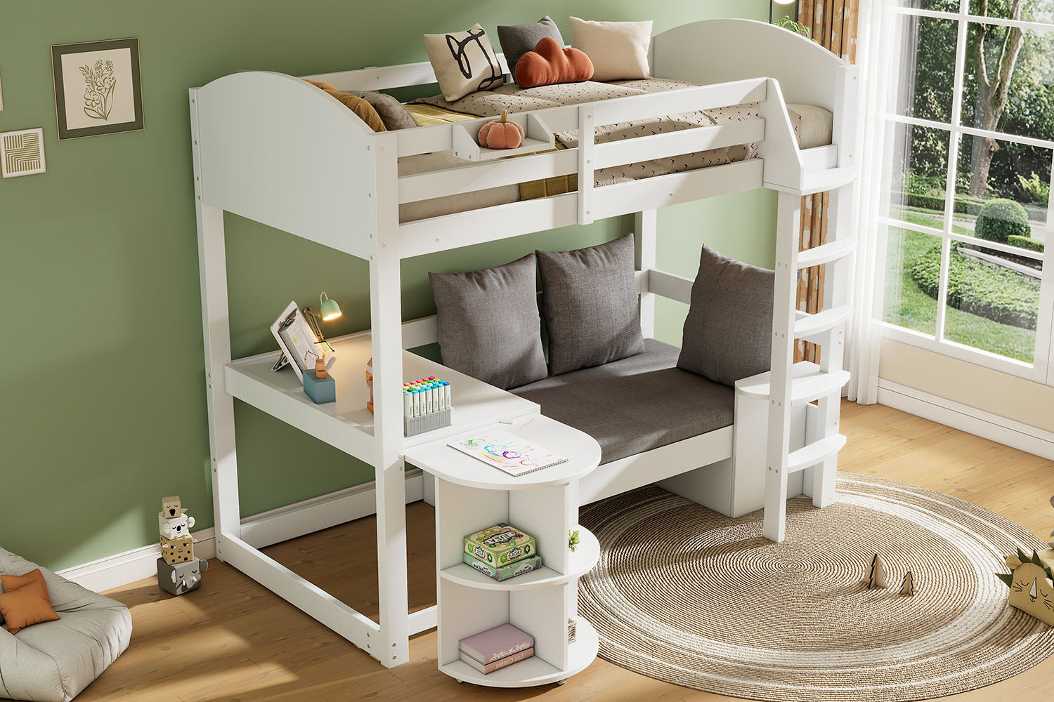 Children's Bunk Bed Multifunctional Ladder Pull-out Table Storage Sofa 90x200, White