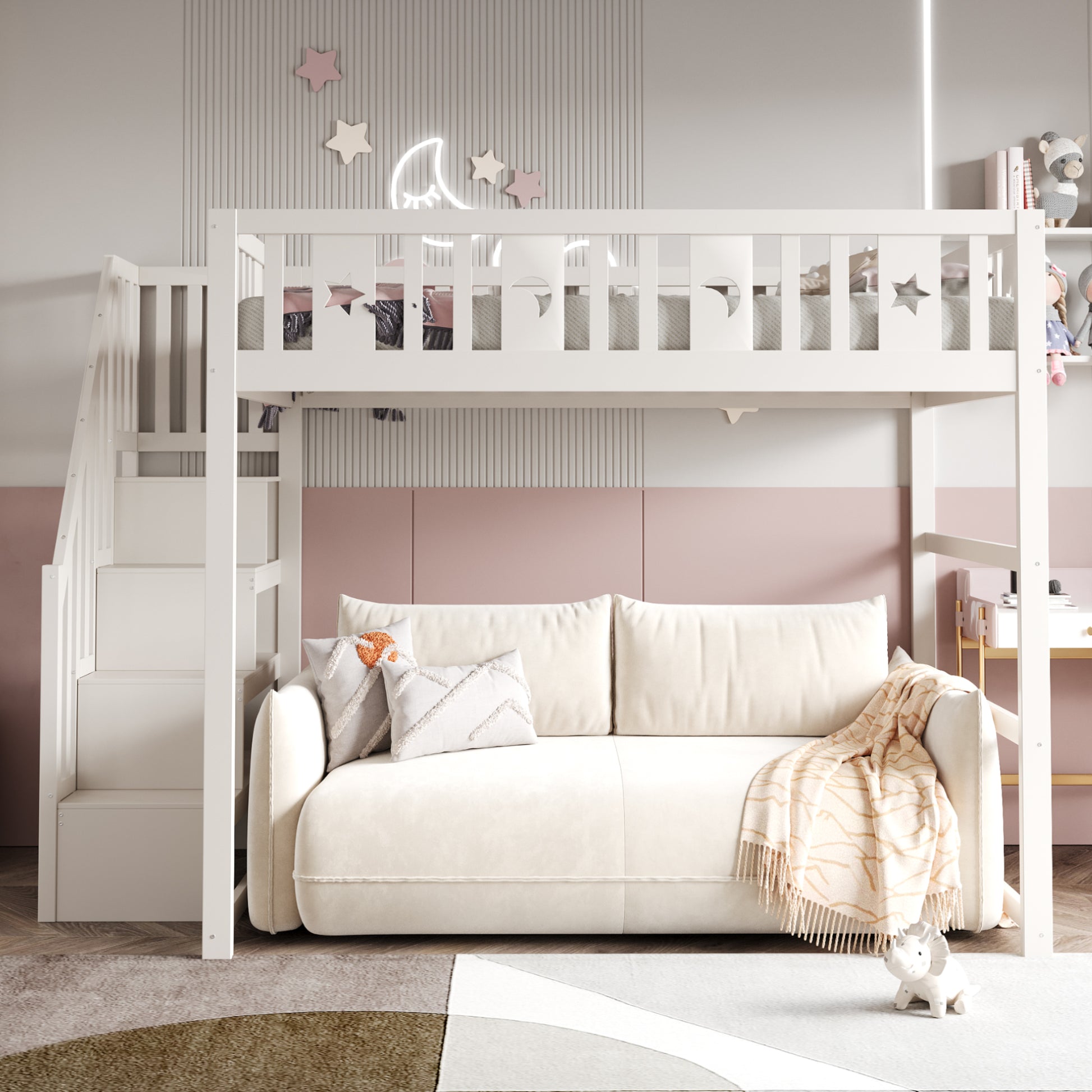 Transform your child's room into a true adventure land with this stylish solid wood loft bed! The thoughtful design features a safe staircase, integrated shelving, and a cozy sofa area, offering not only a comfortable place to sleep but also a haven for playing and relaxing. Charming details like the star and moon motifs create a dreamy atmosphere, while the sturdy construction ensures safety. This is the perfect choice for modern families who appreciate both functionality and design.