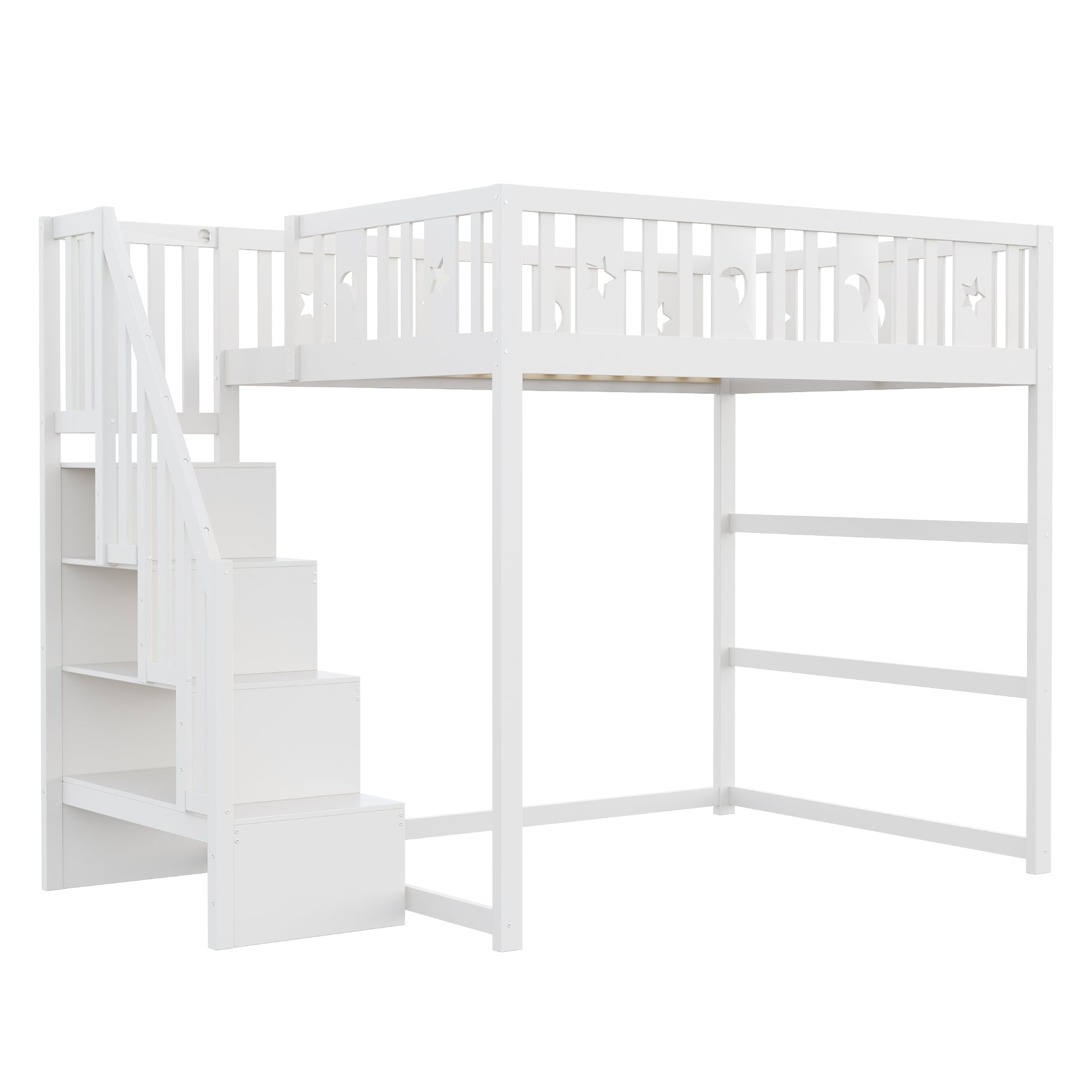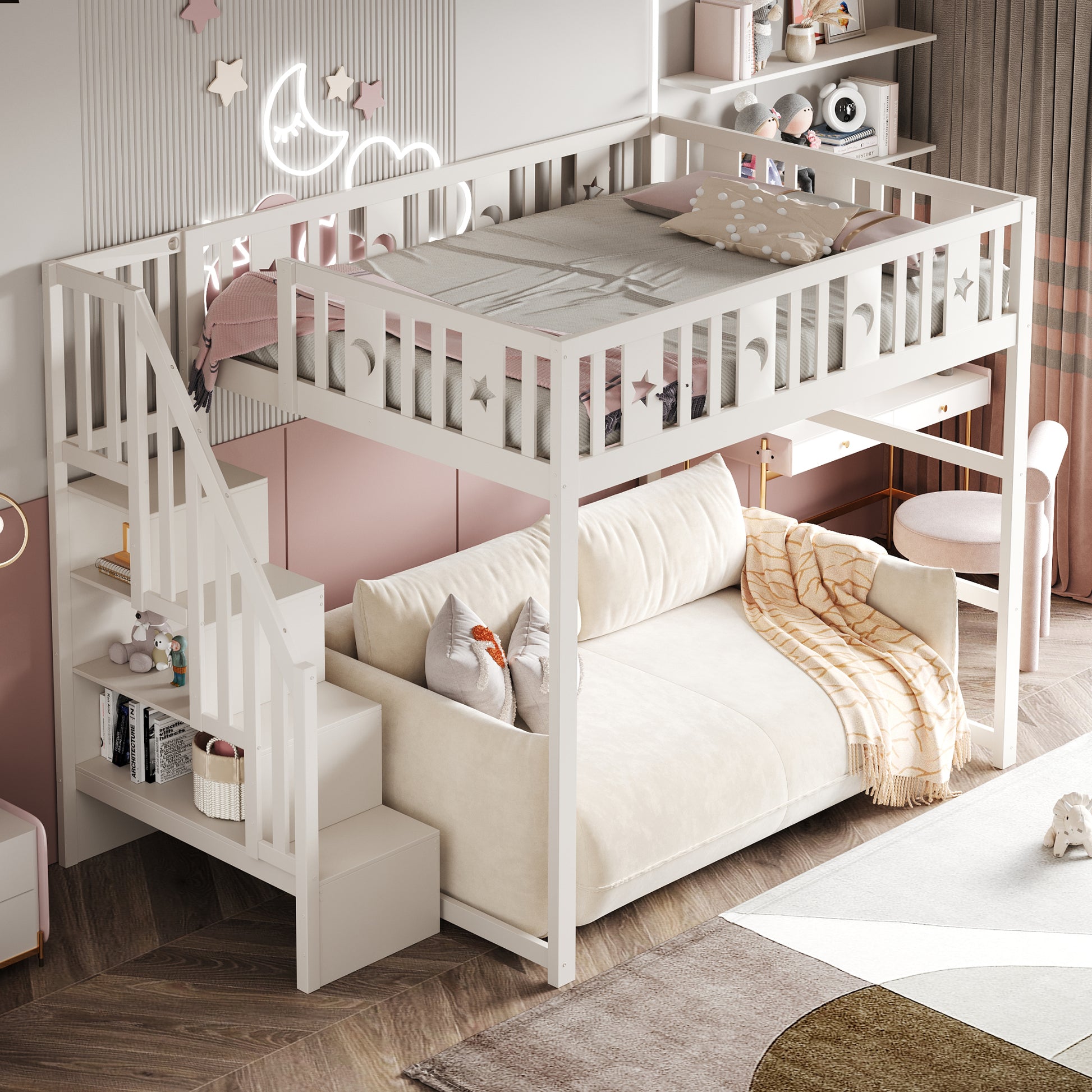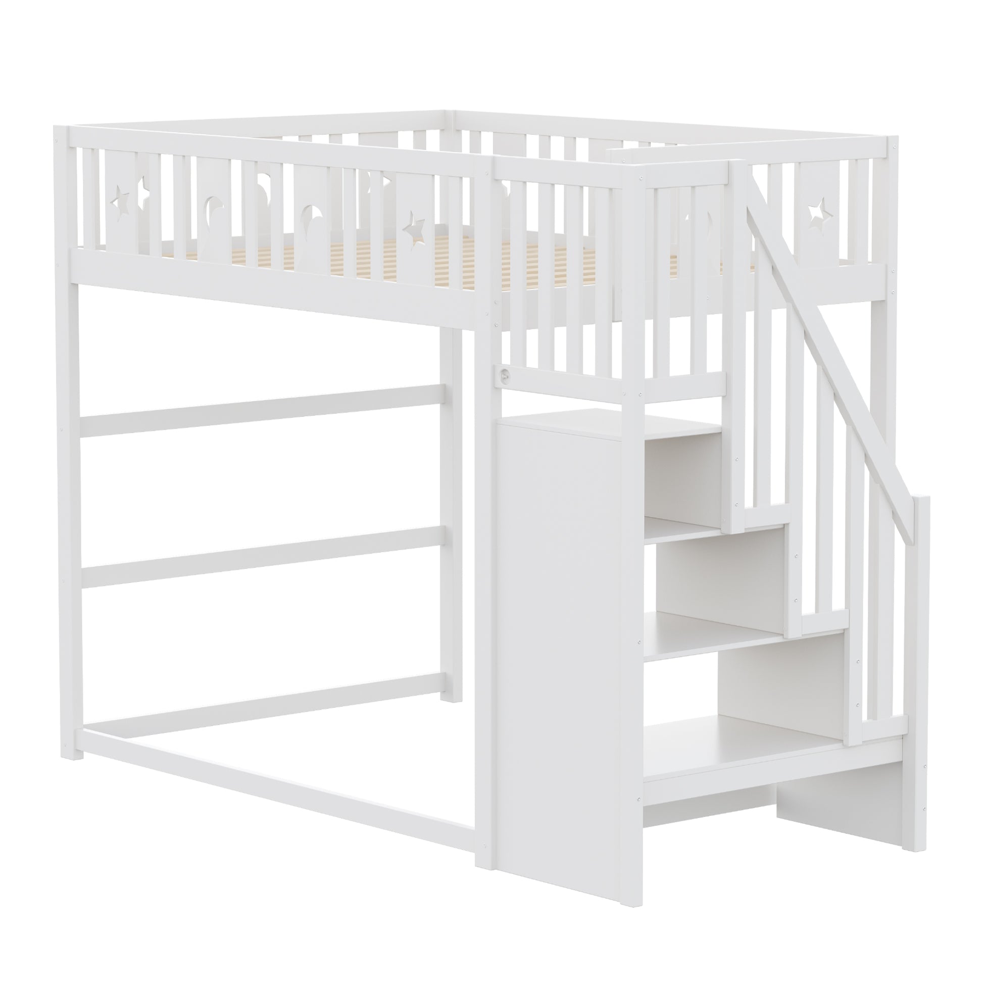 Children's Bunk Bed with Stairs, Safety Railing, Star/Moon Decoration, Solid Wood, White