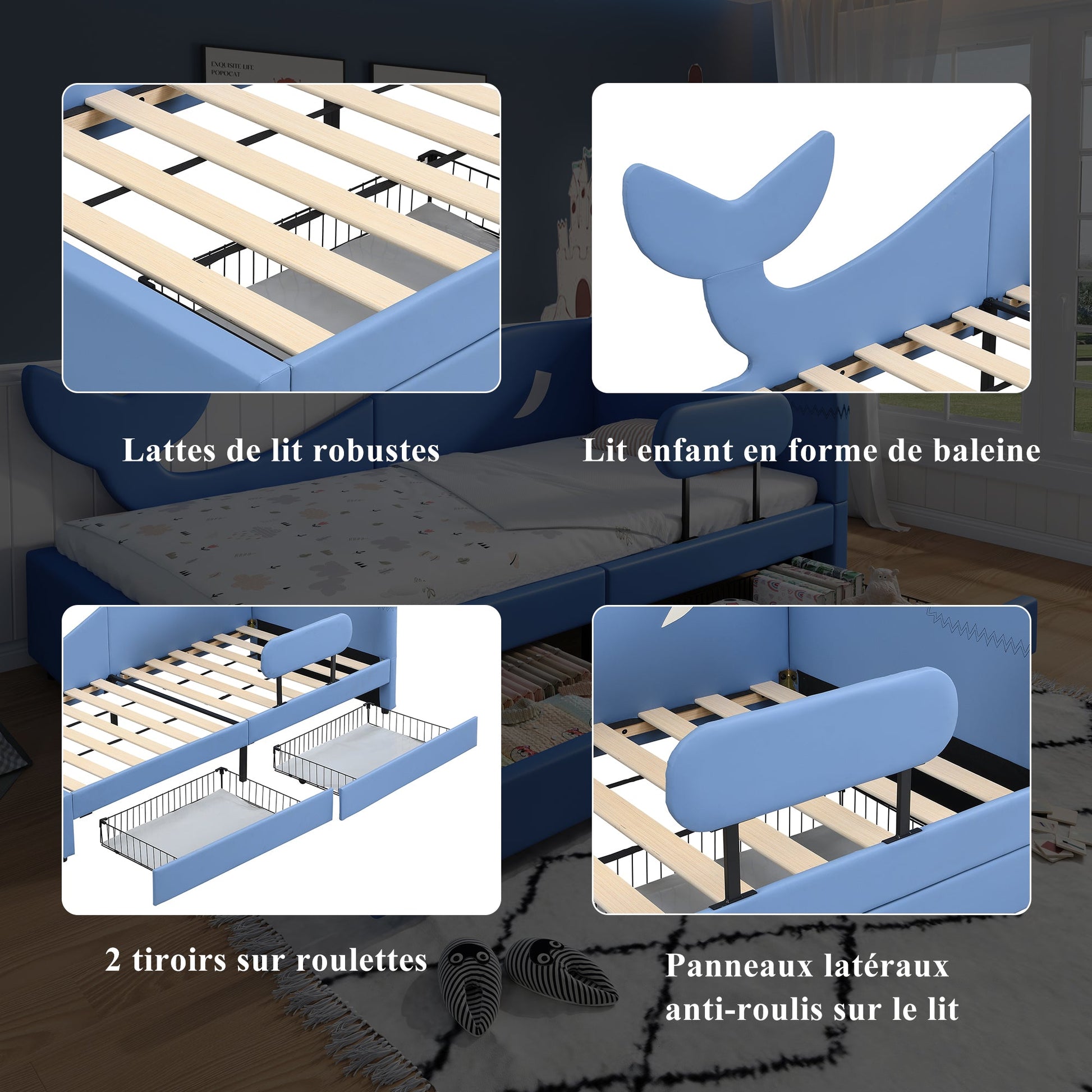 Bring both fun and functionality to your child’s bedroom with this 90 × 200 cm whale-inspired single bed. Featuring a playful blue PU finish and a slightly raised tail, this daybed-style upholstered bed creates a cozy, imaginative space for children. Equipped with a metal frame and two rolling storage drawers, it offers durable support and ample space to store toys, clothes, or other essentials. The raised sides enhance safety, making this bed perfect for independent sleep while keeping your little one secure and comfortable.