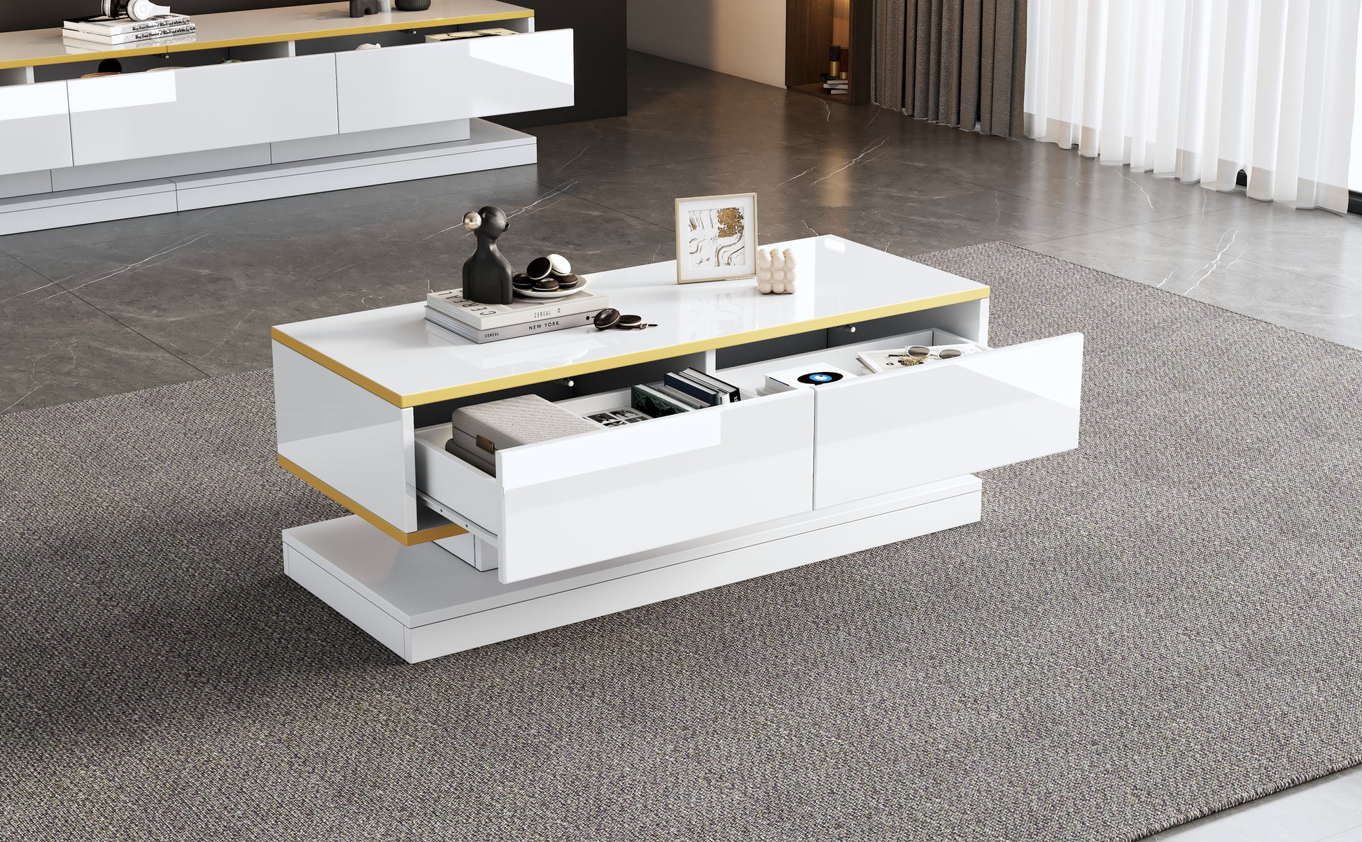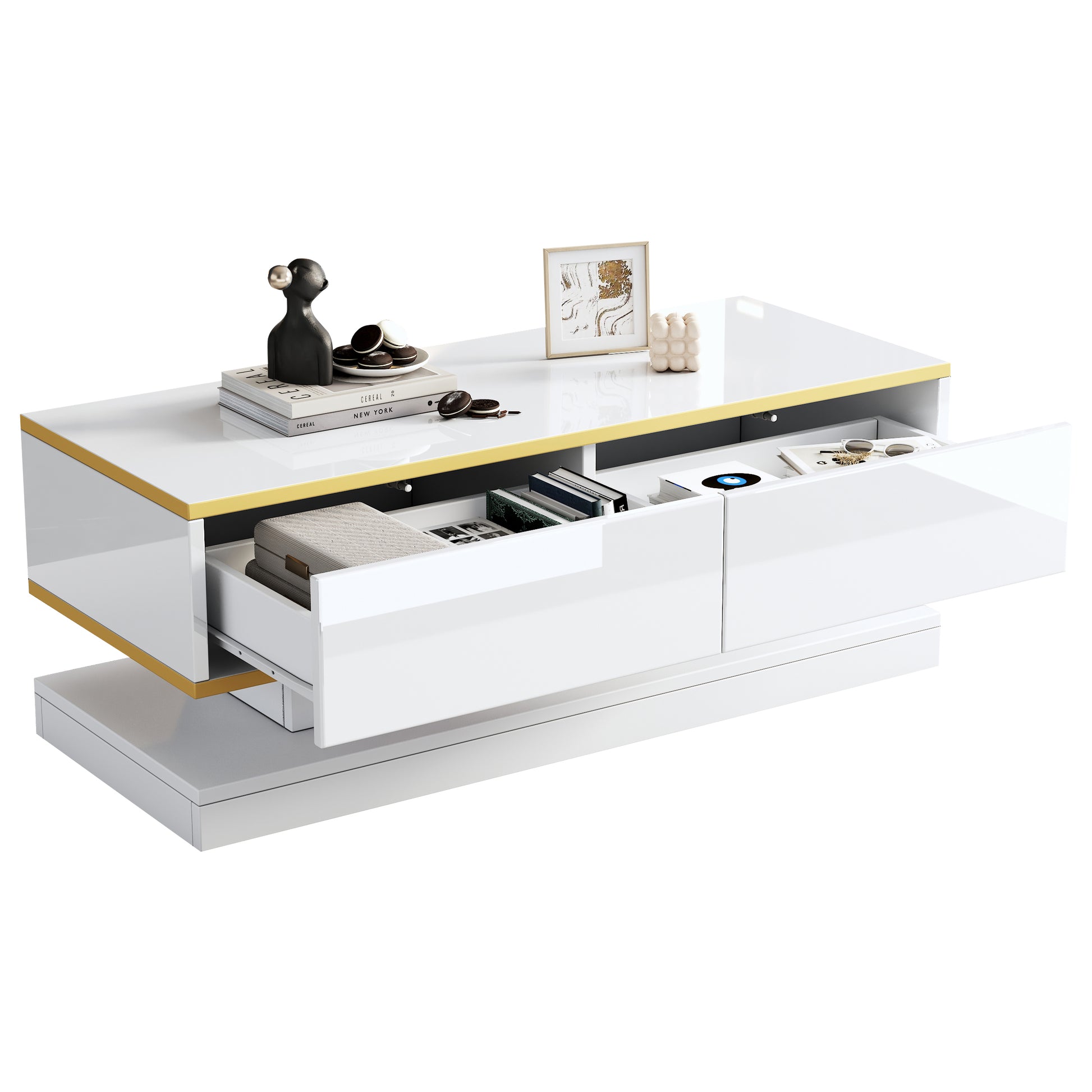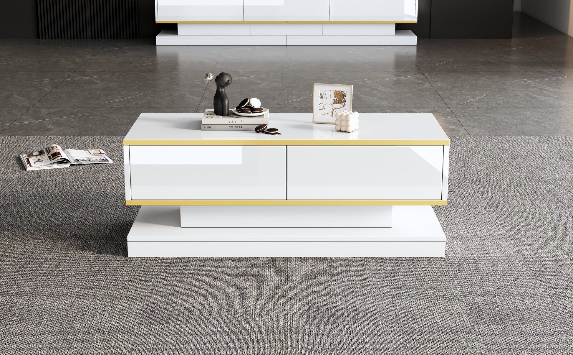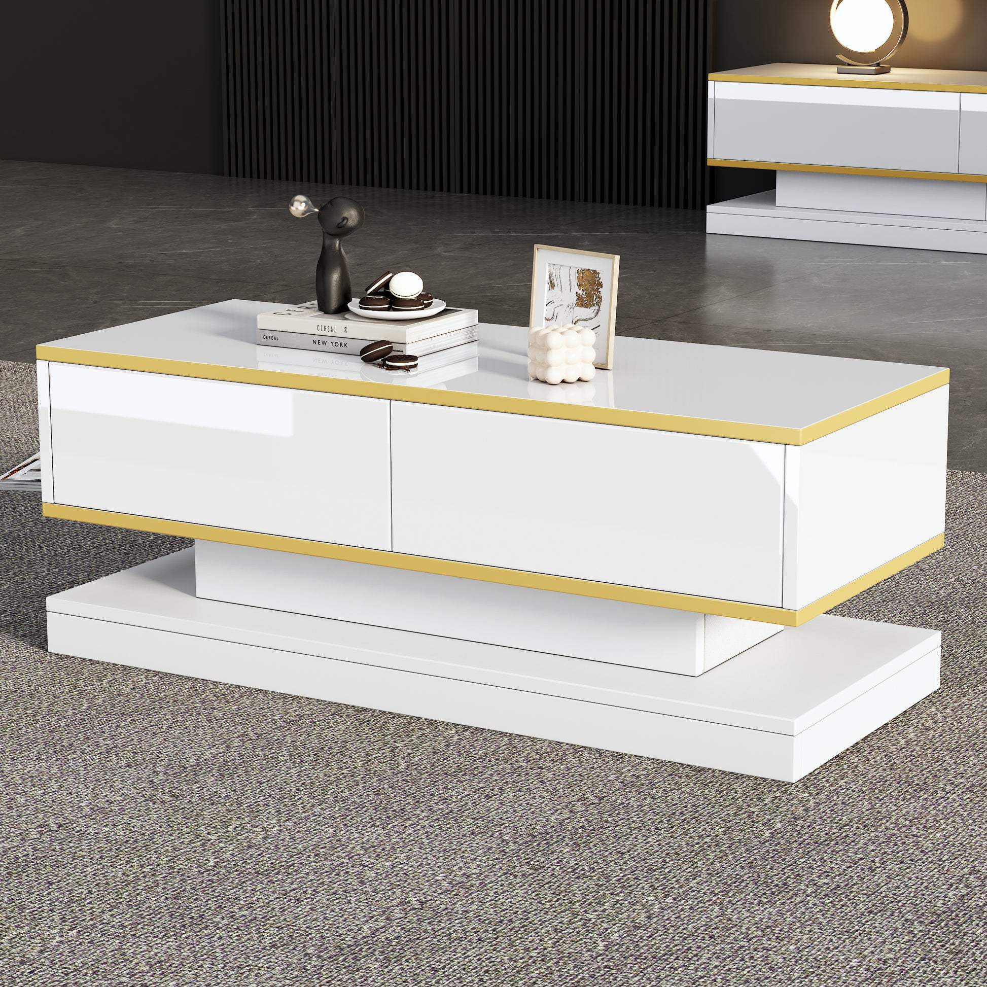 Coffee Table 100x50x38cm High Gloss with 2 Drawers, Warm White and Gold Edge