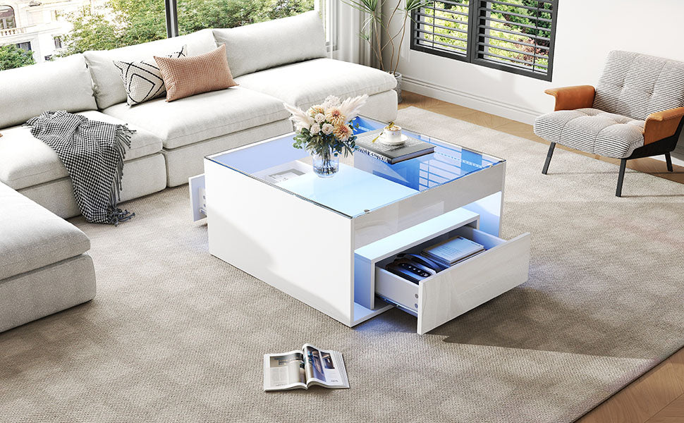 Coffee Table 70x70x35cm High-Gloss LED 2 Drawers Tempered Glass White