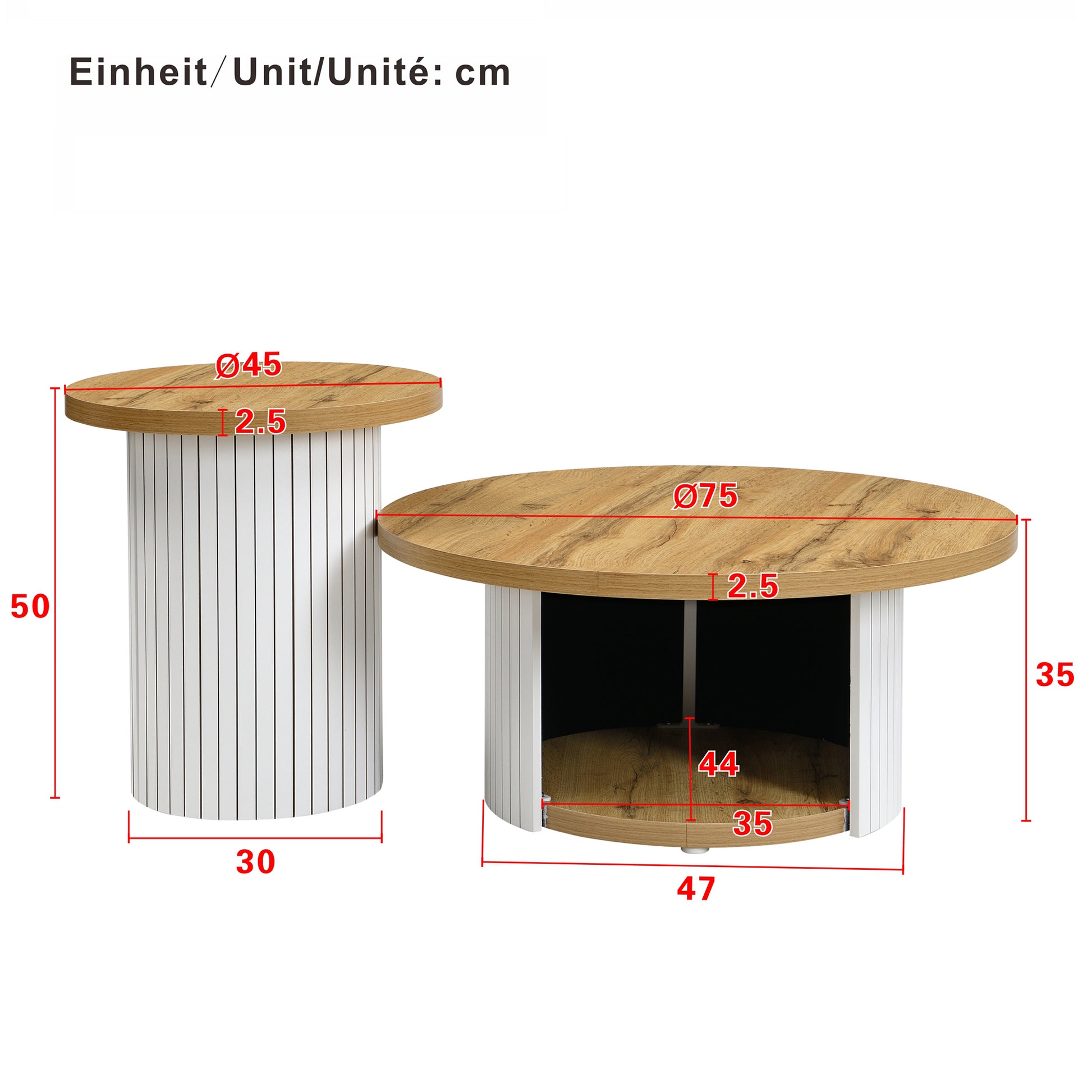This round coffee table set in Nordic style impresses with its flexible design, featuring a main table and a side table that adapt to living rooms of varying sizes. The main table offers practical storage space for books and small items, helping to keep your living room tidy. The side table is ideal for drinks or floral arrangements. The combination of wood tones and vertical stripes gives the set a natural and warm Nordic feel, harmonizing with various interior design styles. The main table invites you to relax, perhaps with a cup of tea or while watching television. The side table provides space for reading, floral arrangements, and much more, offering diverse uses in the living room. Rounded corners prevent bumps and scratches, the wooden tabletop has a fine grain, and the vertical stripe design adds an artistic touch. It's not just a practical storage solution, but also a stylish detail that enhances the aesthetics of your living room, contributing to greater comfort and quality of life.