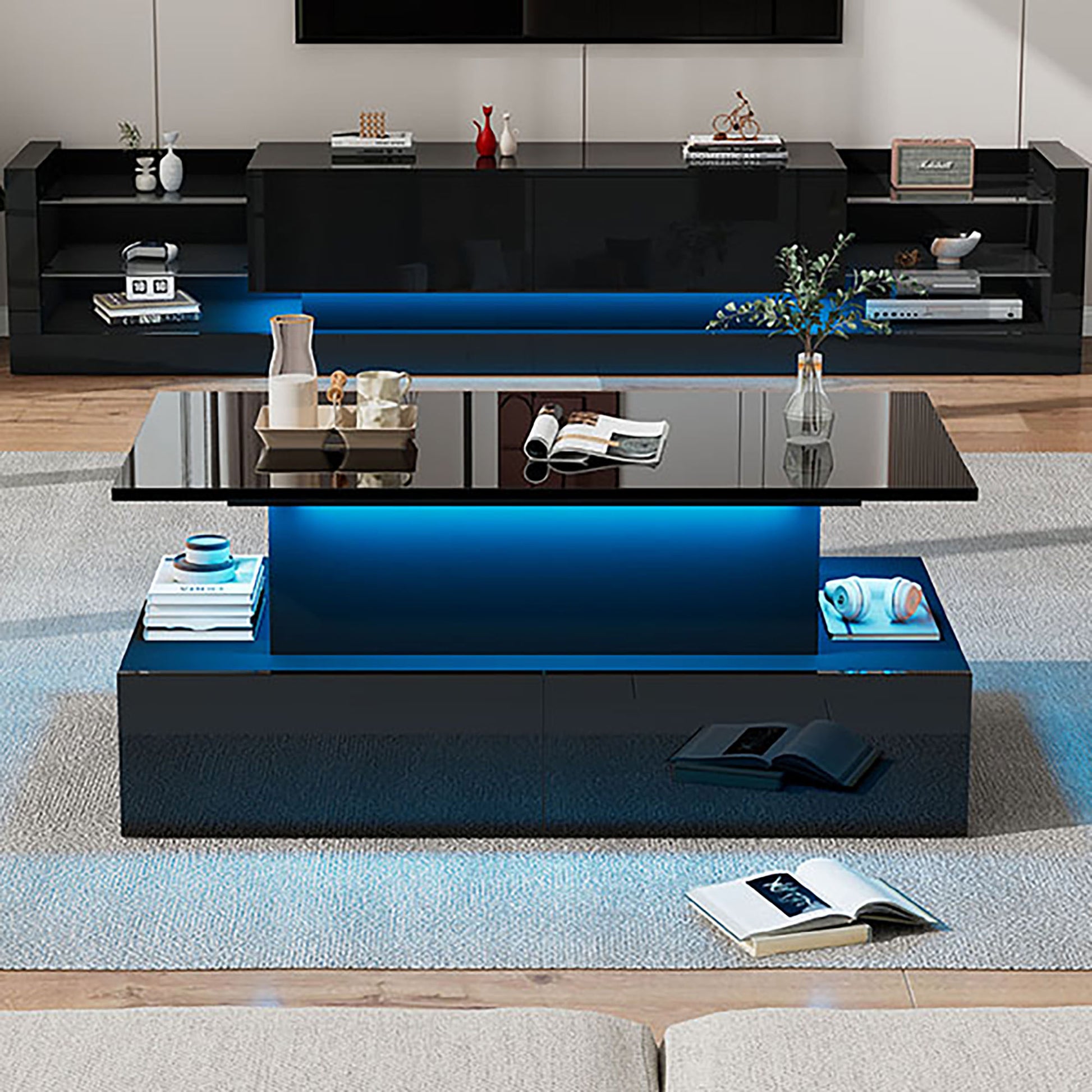 Coffee Table, LED Lit with 4 Drawers, Black High-Gloss