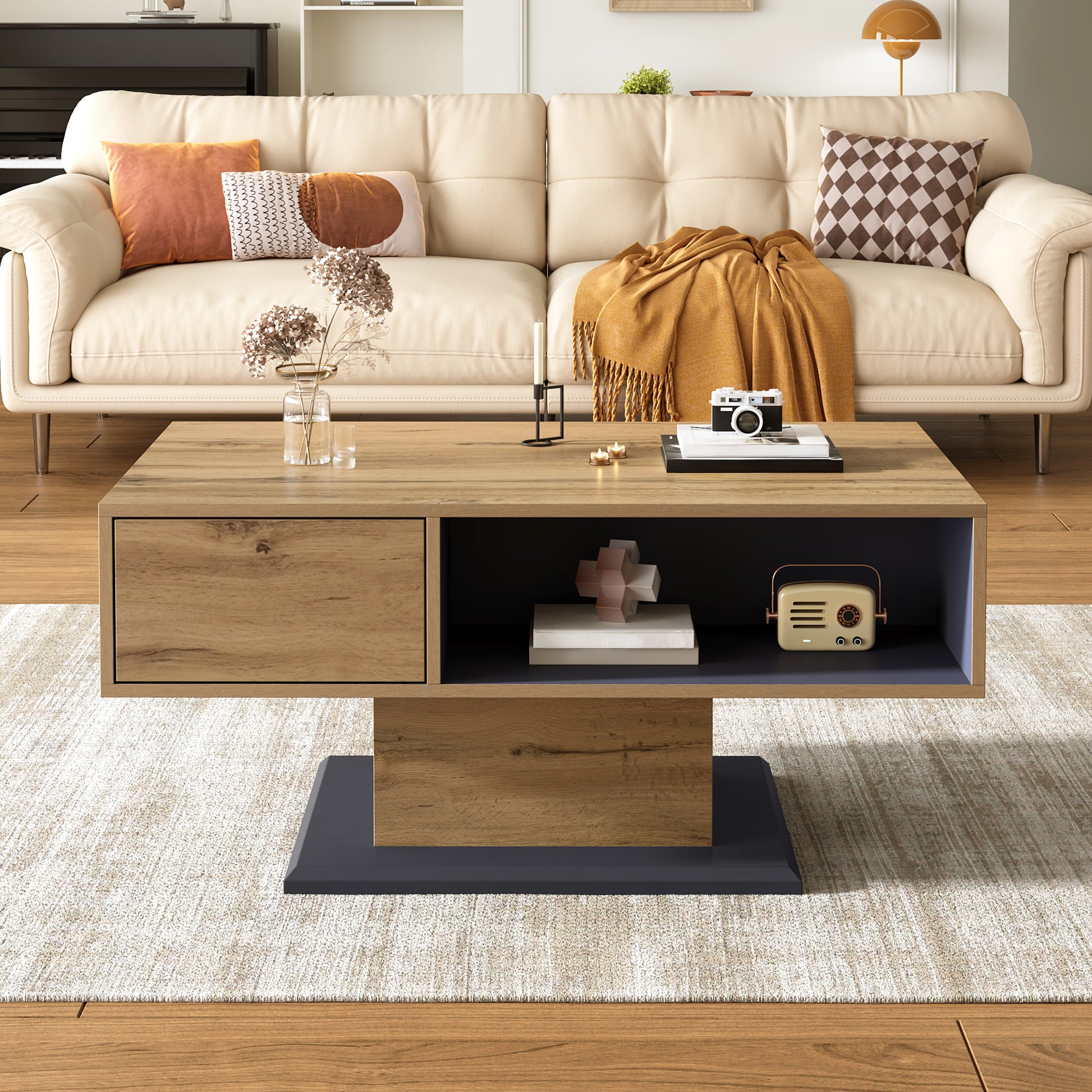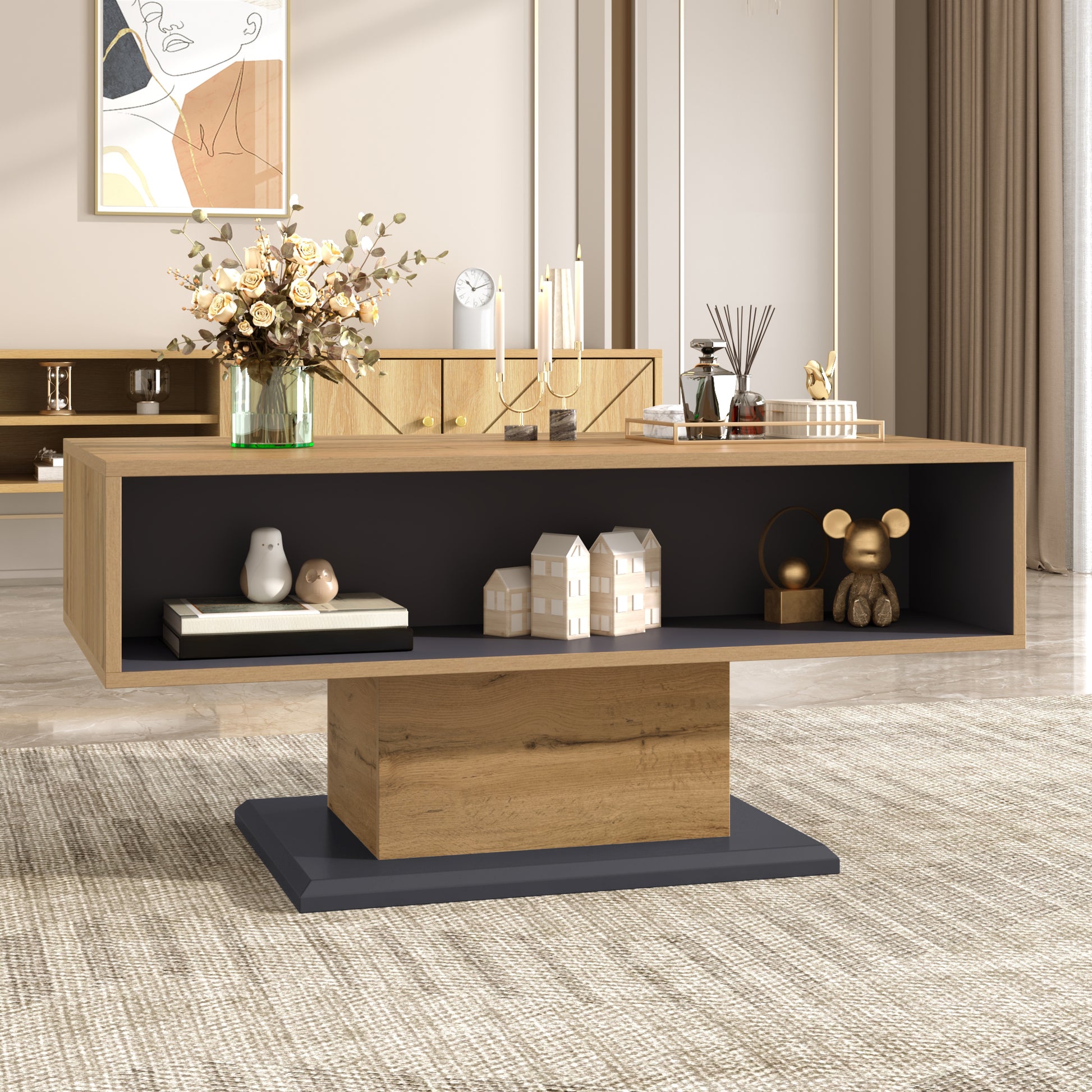 3. Display and double-sided storage: The coffee tabletop and storage compartment are spacious and suitable for various activities such as working, reading, and eating. It can also be used to display plants and eye-catching decorations or simply to store everyday items. The open bottom compartment also offers double-sided storage.