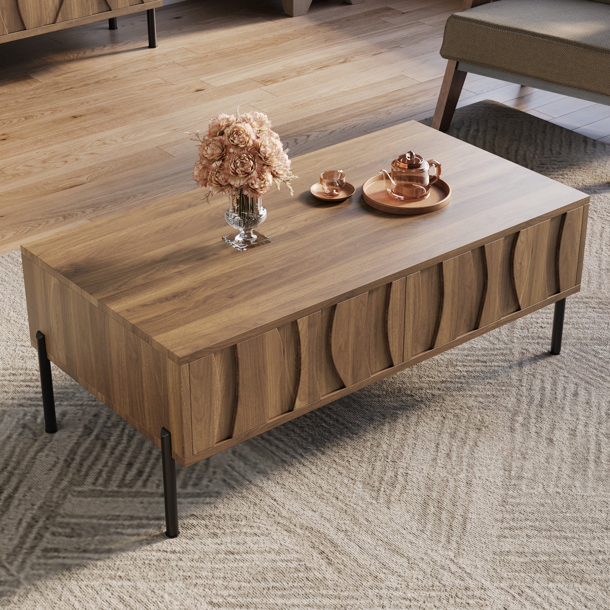 This unique coffee table exudes luxurious vintage charm and blends seamlessly into various interior design styles. Crafted from select wood, its exquisitely designed, three-dimensional, wave-shaped drawers impress with their artistic aesthetic, perfectly complementing American, Scandinavian, and other interior design styles and making it a striking focal point in your living room. Two drawers offer storage for magazines, remote controls, cutlery, and other practical items, keeping the tabletop tidy. The generous tabletop provides ample space for coffee service, decorative items, or electronic devices, thus combining functionality and aesthetics. The slender iron legs are simple yet sturdy, giving the coffee table a light and airy feel. Therefore, this coffee table is suitable for apartments of any size. Its exquisite craftsmanship, durability, and easy assembly make it the ideal choice for your home. It perfectly combines vintage style and functionality, adding a touch of elegance to any living space.