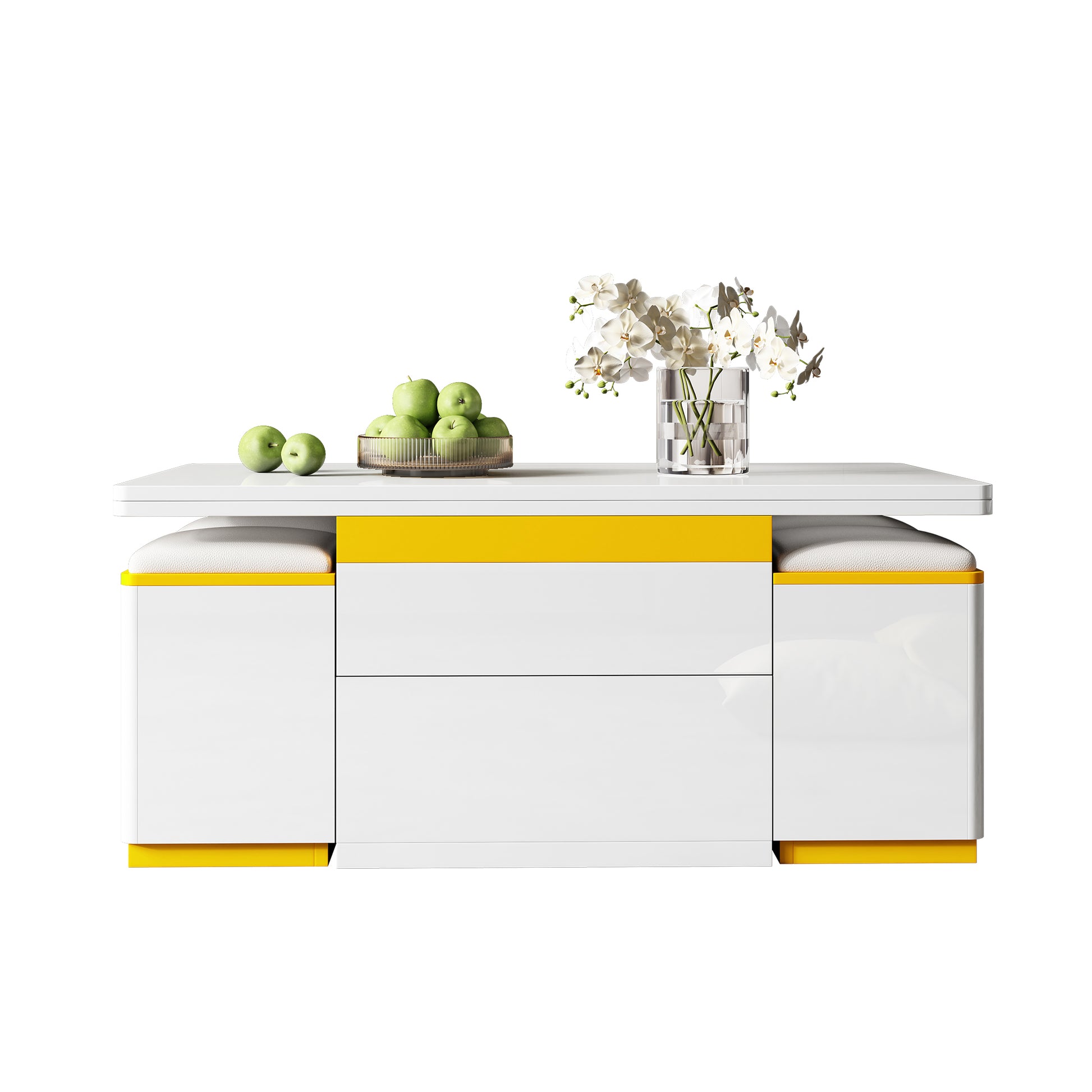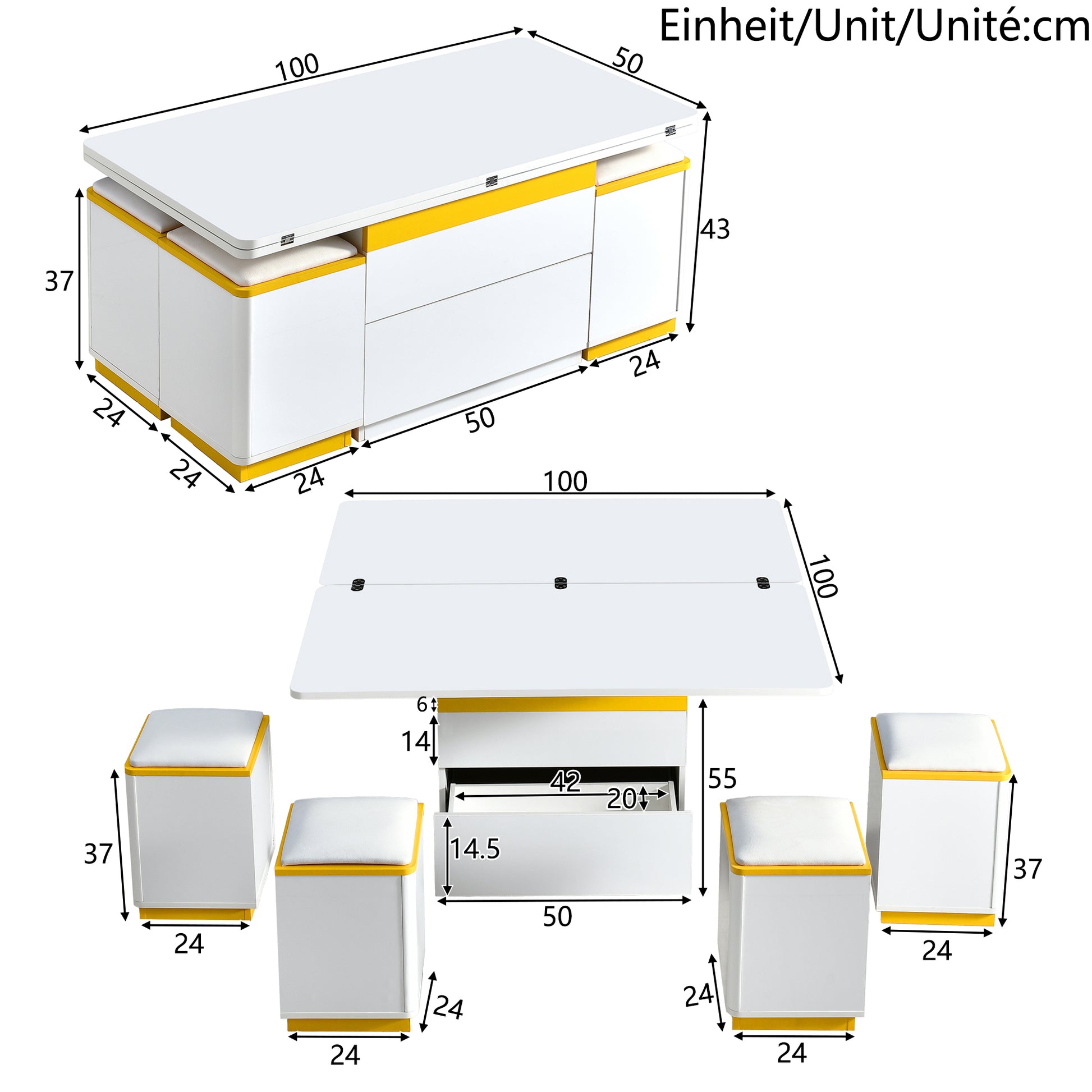 This multifunctional, height-adjustable coffee table combines flexible space utilization with practicality: The tabletop is height-adjustable and foldable, allowing it to quickly transform from a coffee table to a dining table or desk – ideal for small apartments. The integrated cabinet offers drawers and open shelves. Together with four matching storage stools, it forms a system of coffee table, seating, and storage, thus optimizing space utilization. The clean lines in white and yellow perfectly complement modern living styles and harmonize with minimalist, industrial, and other interior design styles. Thanks to its compact design, the table requires no additional accessories and, when unfolded, offers seating for several people. This makes it the ideal furniture solution for small living rooms and apartments.