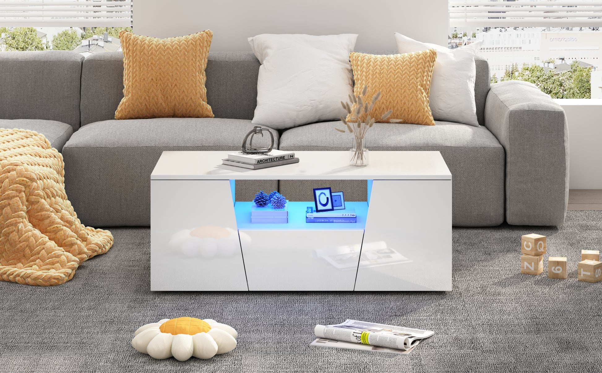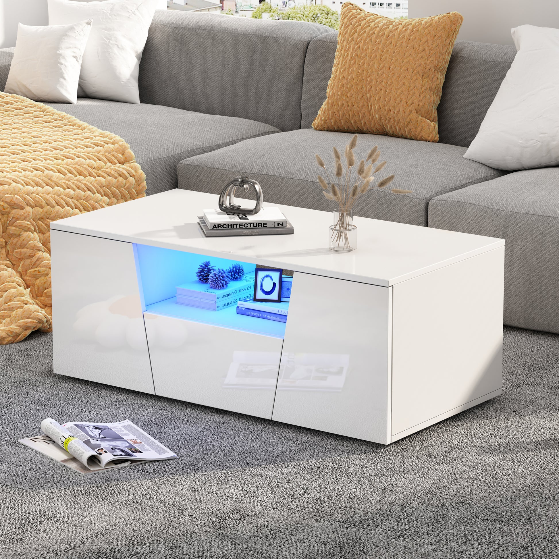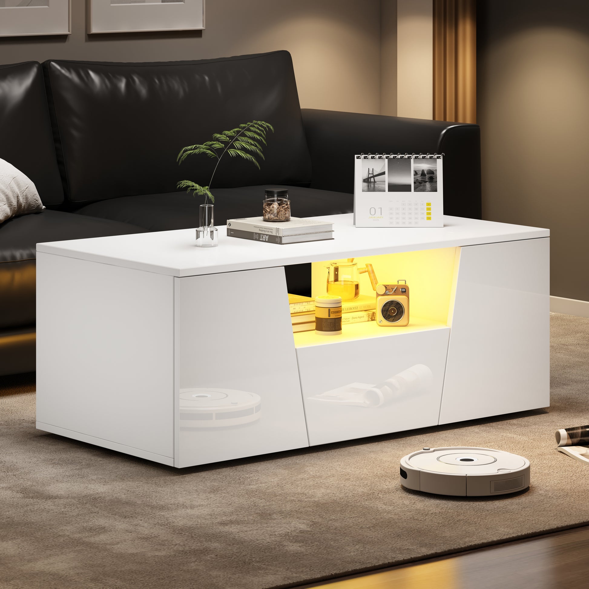 This 100 x 50 x 40 cm coffee table features an LED light strip controllable via a mobile app, and boasts a high-gloss finish on its top and front surfaces. It offers ample storage with two cabinets, one drawer, and a central hollow storage space. The cabinet doors and drawers have an irregular design, adding a unique touch. Made from durable chipboard, this white coffee table has a recommended load capacity of 50 kg. The LED lights are USB powered (5V 2A USB cable included, plug not included) for safe and easy indoor use, connectable to your TV, computer, or power bank.