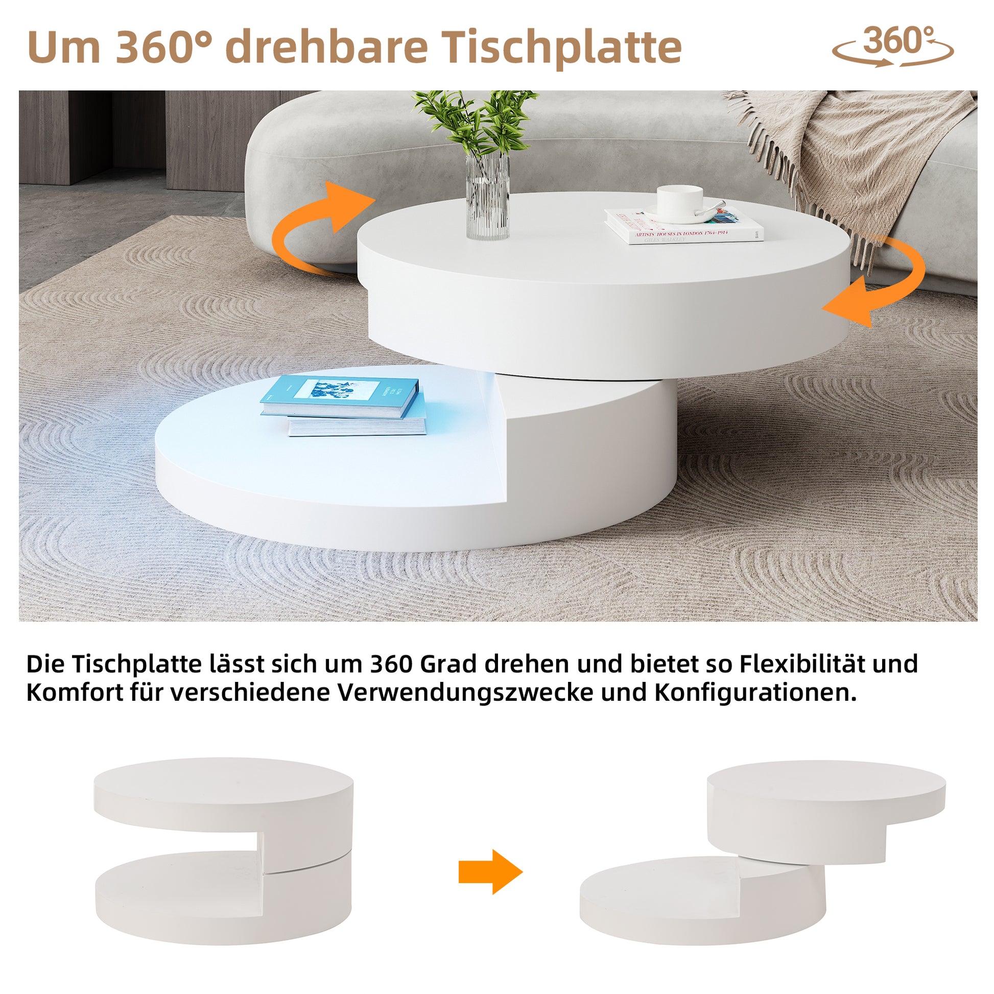 This cylindrical coffee table, 70 cm in diameter and 35.5 cm high, is made of MDF and finished with a spray-on paint. The paint is even, textured, and wear-resistant. It requires little space and is suitable for many types of homes. The tabletop rotates 360 degrees, making it easy to access items. The two-tiered design allows for layered storage, keeping items organized. It is equipped with 16-color LED light strips to create different ambiances. The rounded shape has no sharp edges and is safe and comfortable. The simple white design complements various styles, such as modern and Nordic. It integrates features like rotation, storage, and creating ambiance in limited spaces, effectively enhancing the practicality and aesthetics of your living space. The recommended total load capacity is 30 kg, and everyday items can be placed securely.