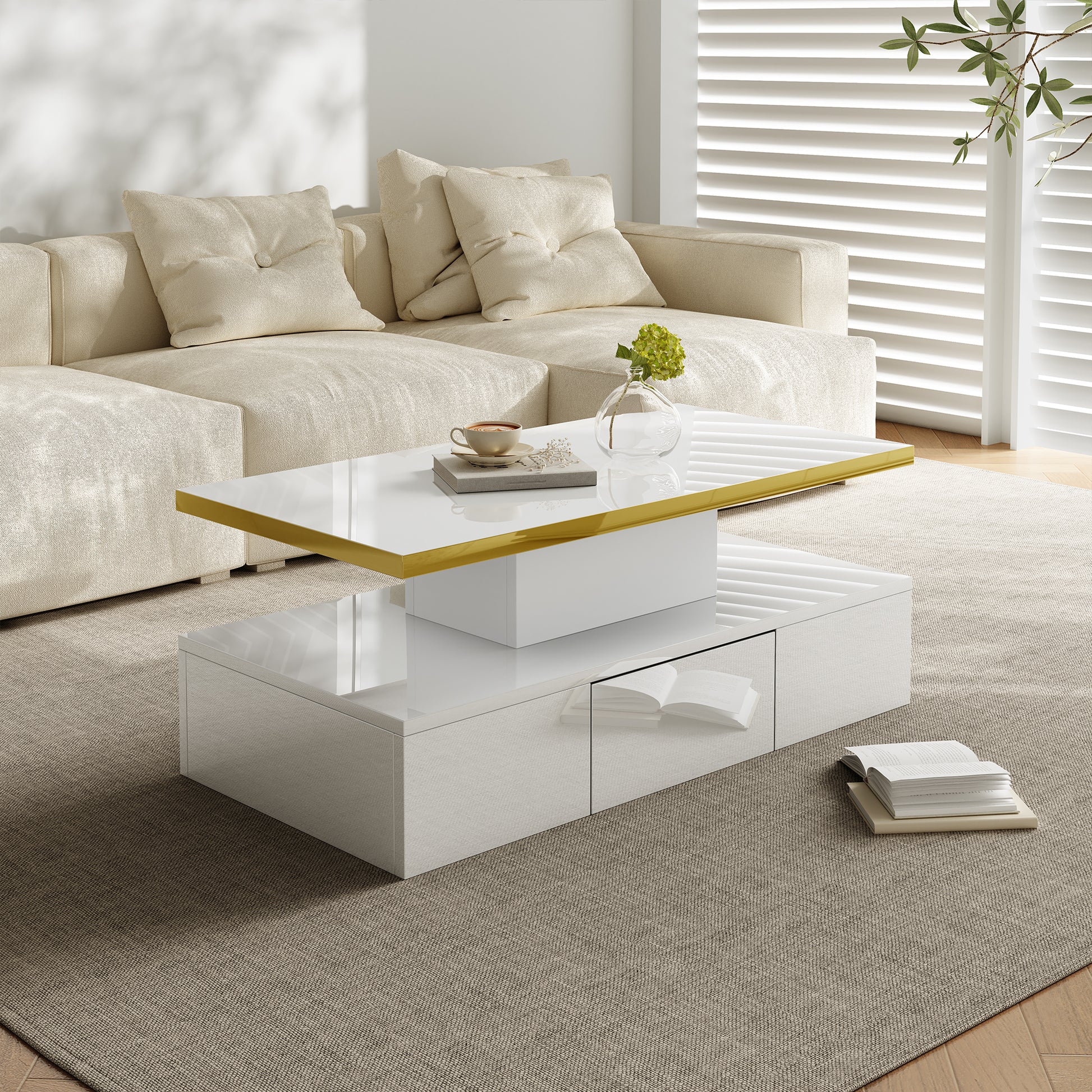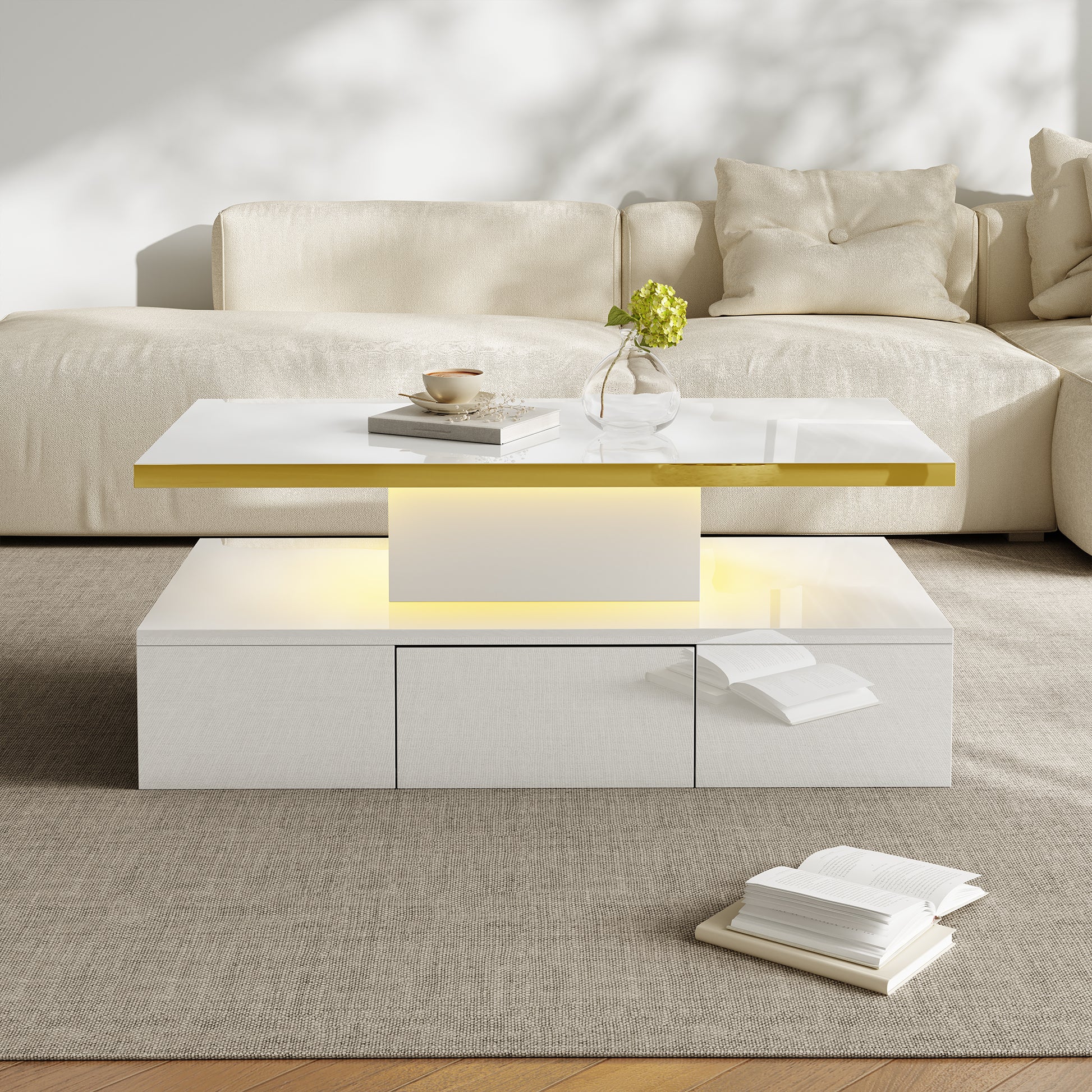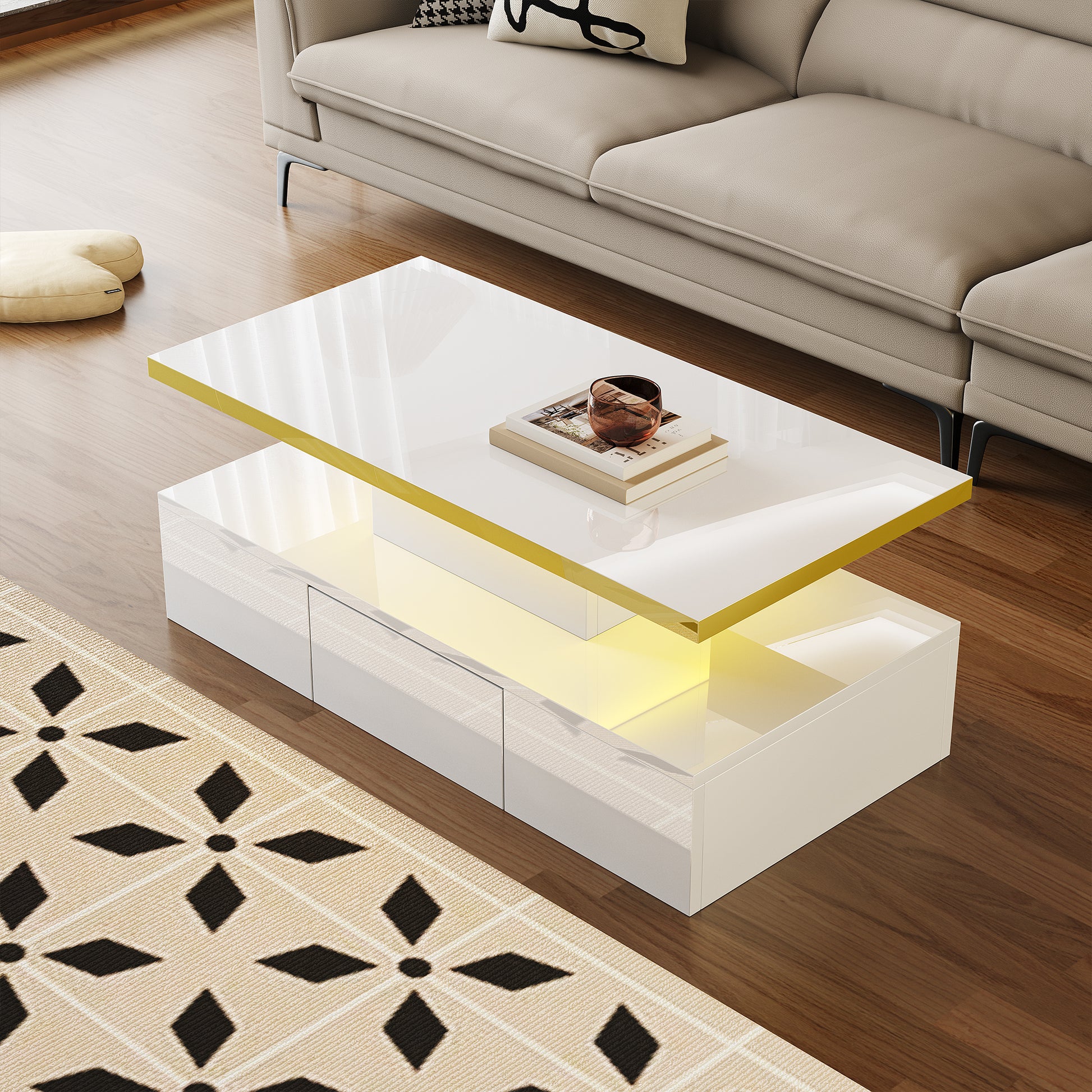 Coffee Table with Drawers, High-Gloss Lacquer Finish, Two Shelves, LED Light