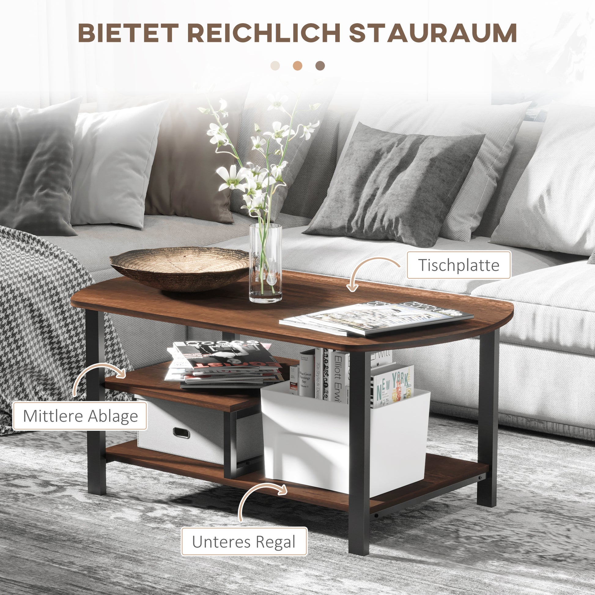 Coffee Table with Storage Surfaces, 100x60x46cm, Chipboard and Steel Brown