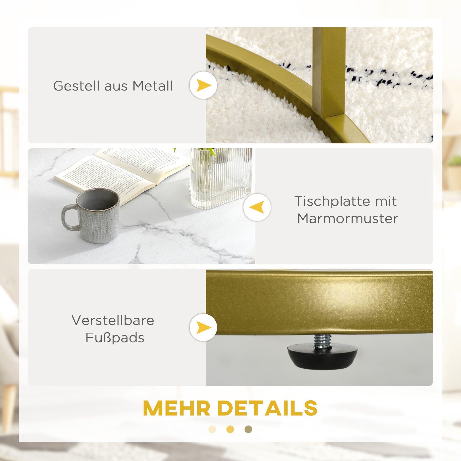 Elegant Design: The round coffee tables with white marble-effect tabletops and gold metal frames add a touch of luxury to your living space and attract attention - a stylish highlight in any room.