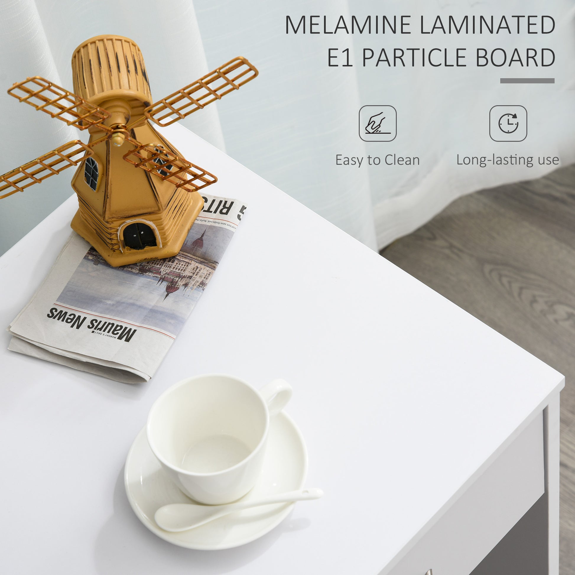 Durable: Crafted from durable particle board, the writing desk is suitable for everyday use. The melamine coating provides a smooth finish that offers light protection against daily wear. The iron handle is a sleek addition to the overall design for easy drawer opening and closing.
