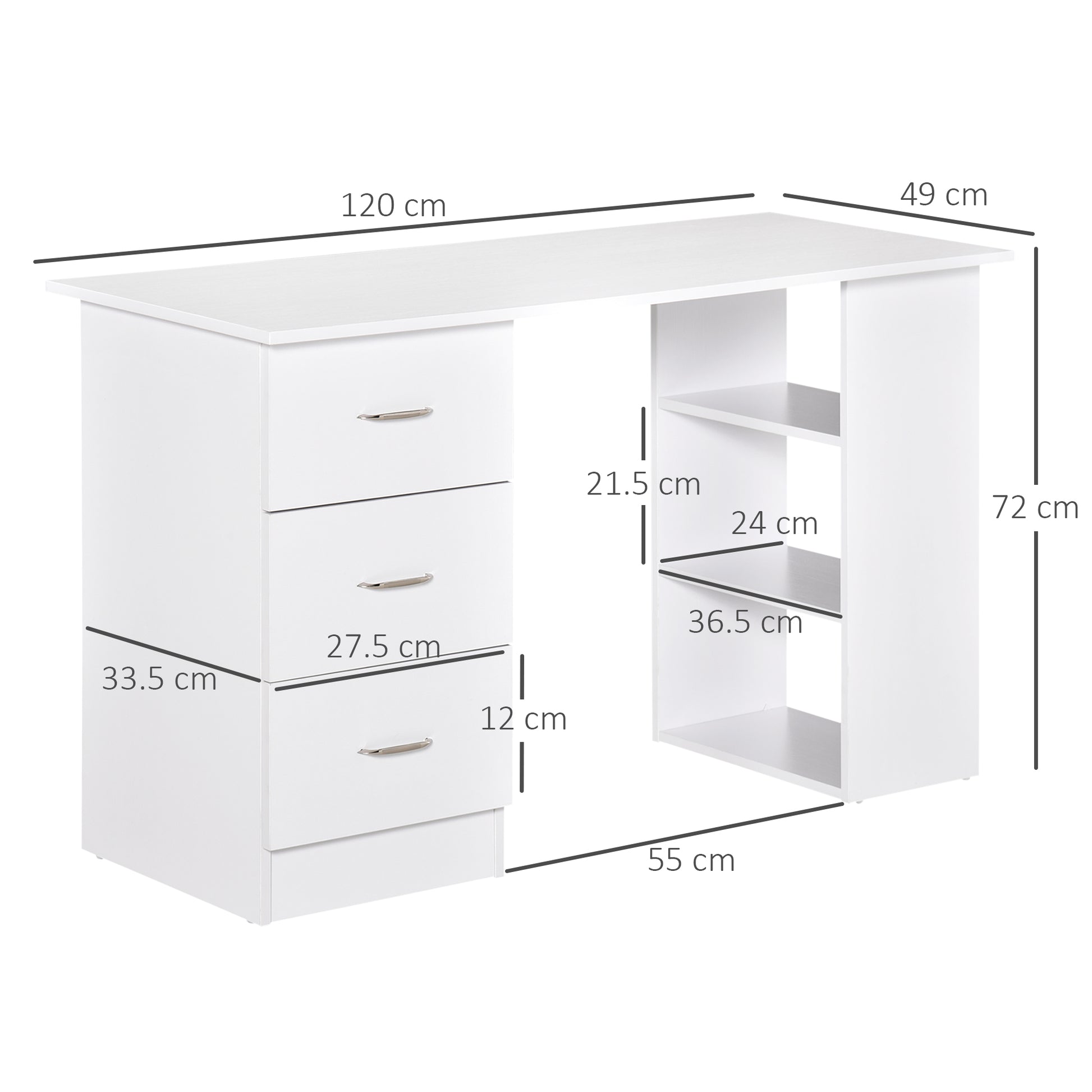 3-Tier Shelves & 3 Drawers: This home office desk features 3 drawers for storing your office essentials. 3 open shelves provide extra space for displaying your favourite items. The drawer can be installed back or forth according to your needs, which makes the open shelf can be on the left or the right side