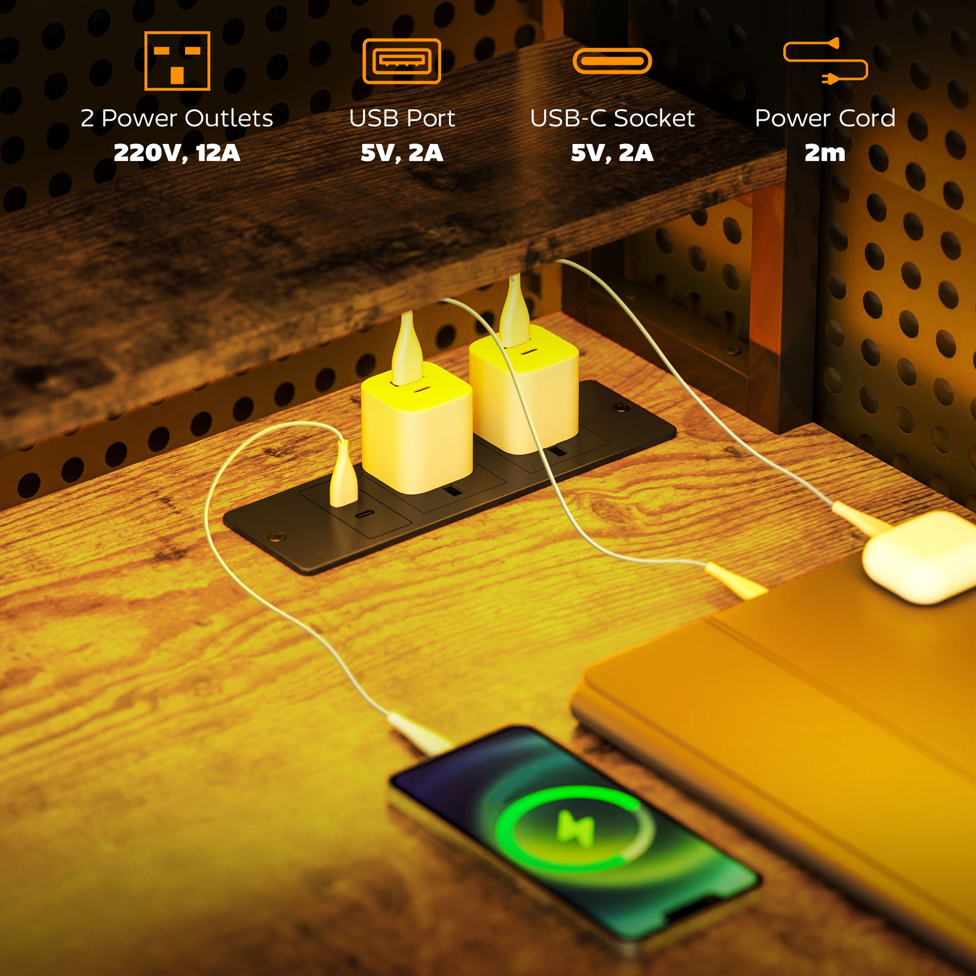 Keep your devices powered while you work with the integrated charging station, which includes two power outlets and two USB ports.