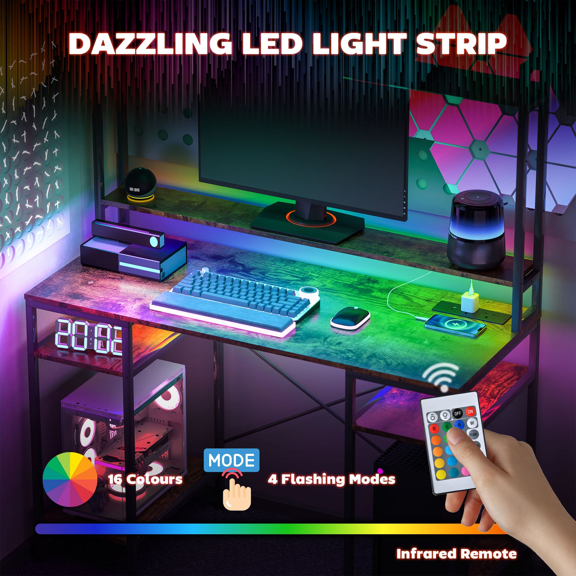 This computer desk features integrated 16-color RGB LED lights. The lights also include four flashing modes, which are controlled by an infrared remote. This allows the office desk to create the ambience you want.