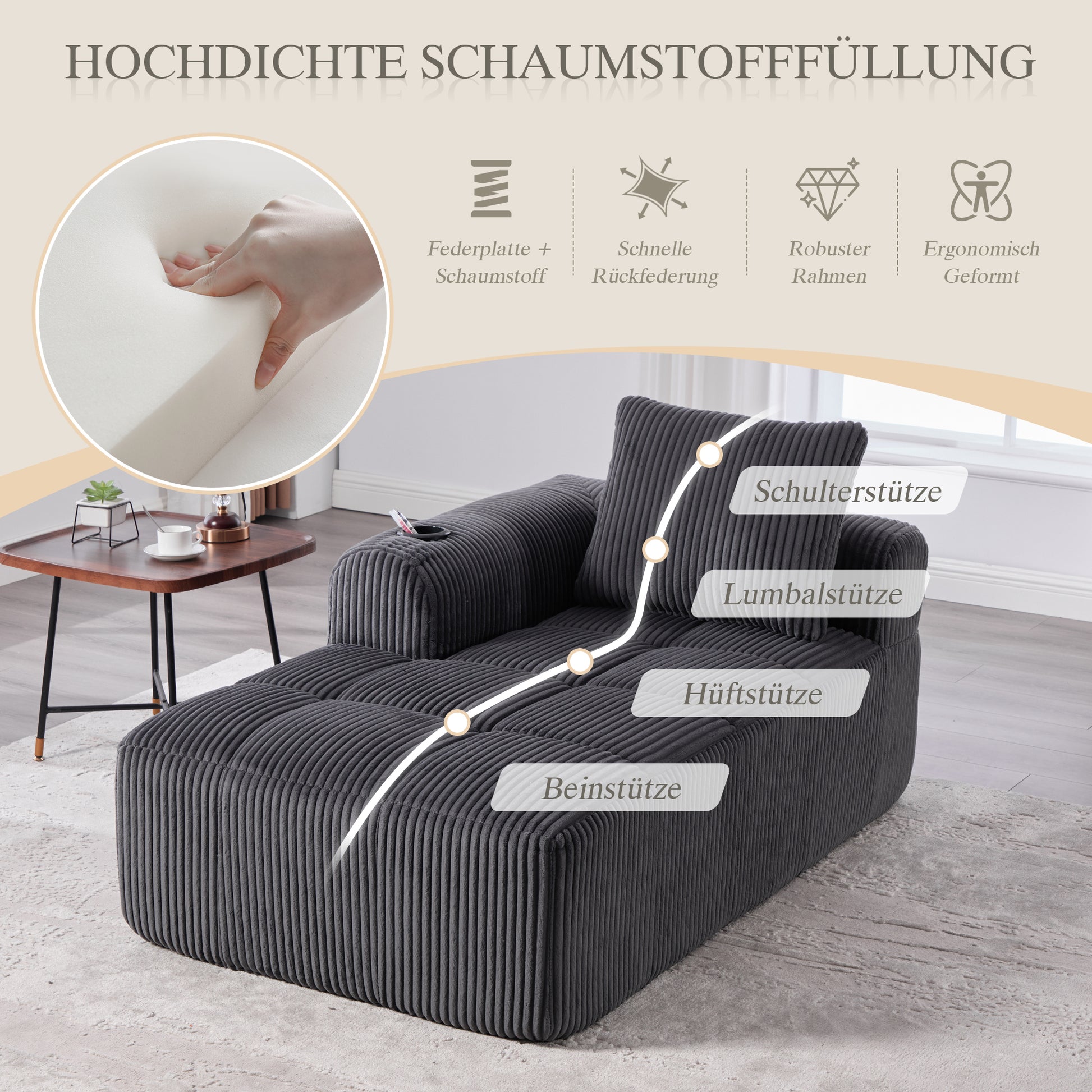 Inside the sofa, you'll find high-density foam padding with excellent resilience, combined with integrated spring elements. This combination provides a soft yet supportive feel—not too soft to provide adequate support, and not too firm to cause discomfort. It effectively reduces strain on the spine, even during extended periods of sitting or napping. The spring elements also enhance the sofa's stability and extend its lifespan.