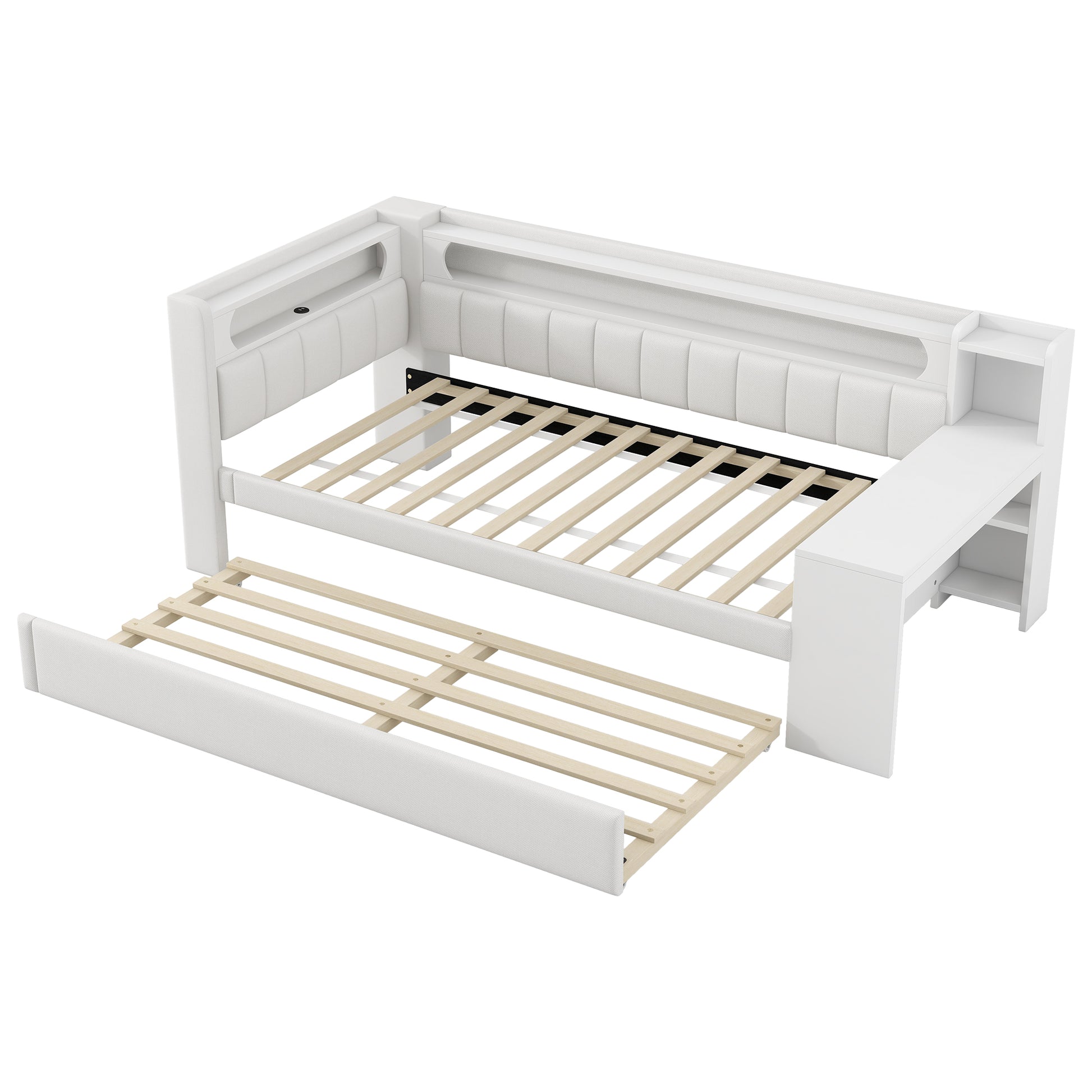 Daybed Upholstered 90x200cm Pull-out Bed Desk LED USB - White