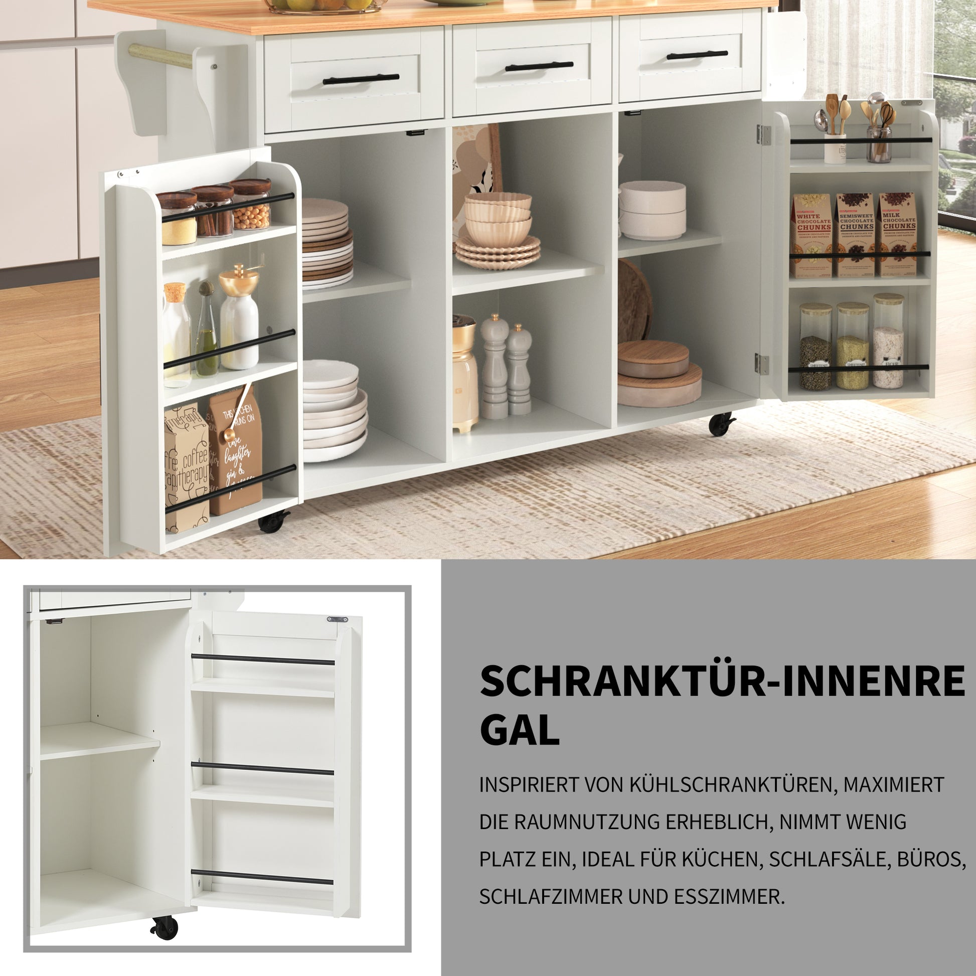 This elegant kitchen island brings comfort and more living space to your home. With its thoughtful combination of storage, everything has its place. This product boasts a stunning modern design and functional layout, offering numerous options for storing your kitchen utensils efficiently. Made of sturdy particleboard, the kitchen cart features smooth-rolling casters for mobility and a fresh, timeless look. It also includes five solid wooden feet that can be used to replace the casters for a stationary unit.