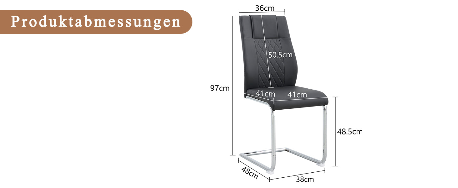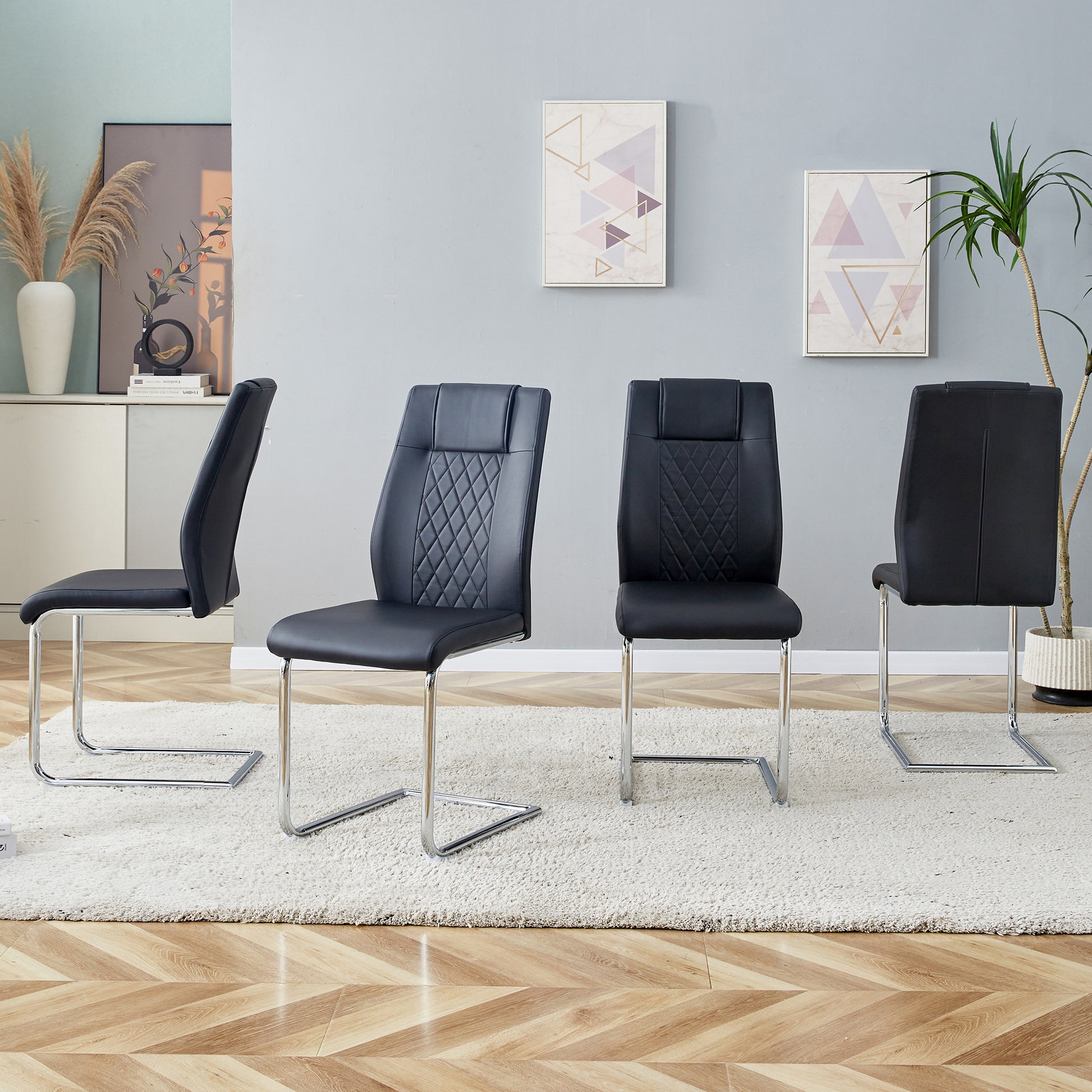 Silver metal chair legs. The silver metal legs create a harmonious unity with the black PU seats and backrests, adding a bright touch that reflects the sophistication and luxury of modern home furnishings.