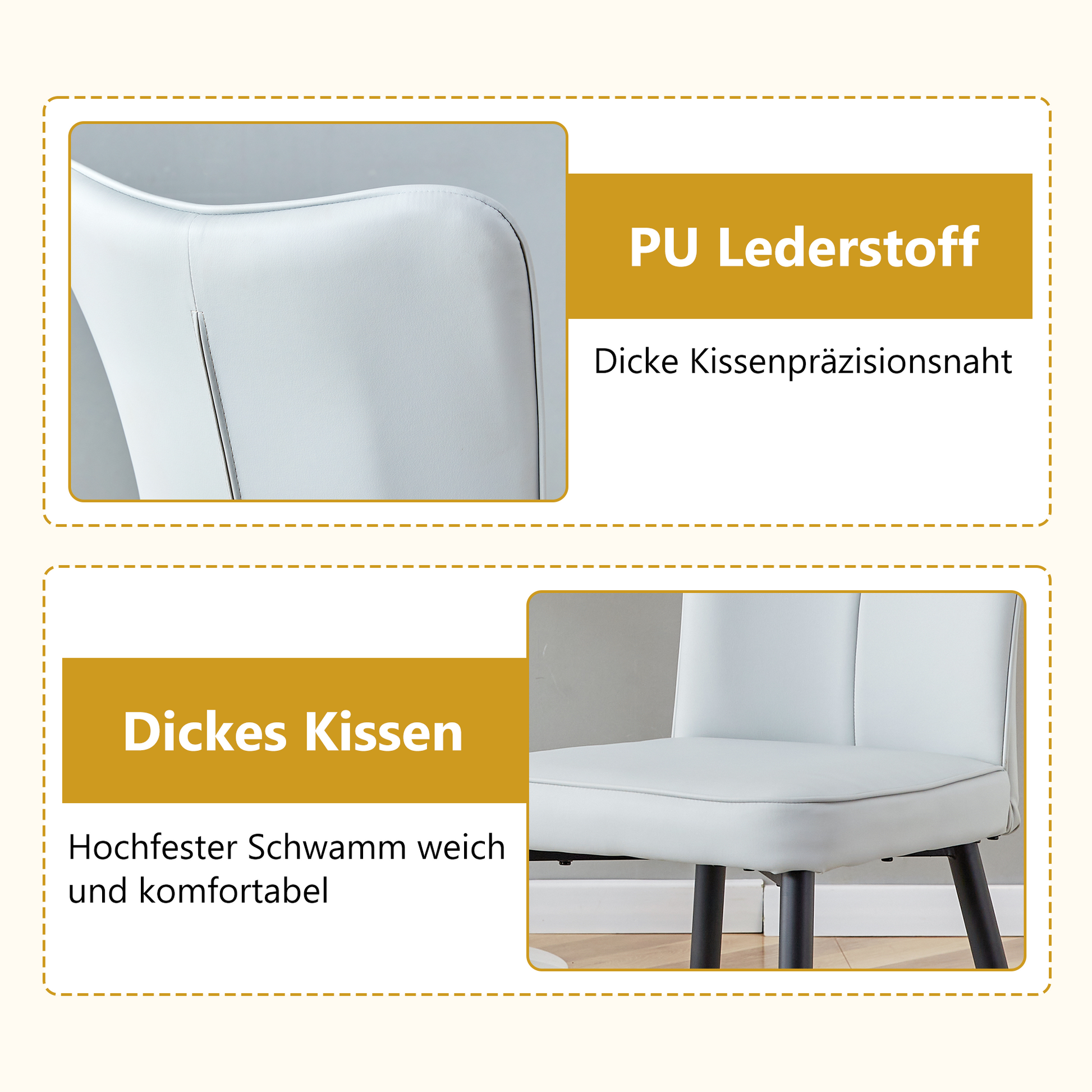 The backrest and seat are made of PU material combined with metal components. This not only gives it an elegant look but also makes cleaning particularly easy. A simple wipe with a damp cloth and mild detergent is all it takes to make the dining chair look like new.