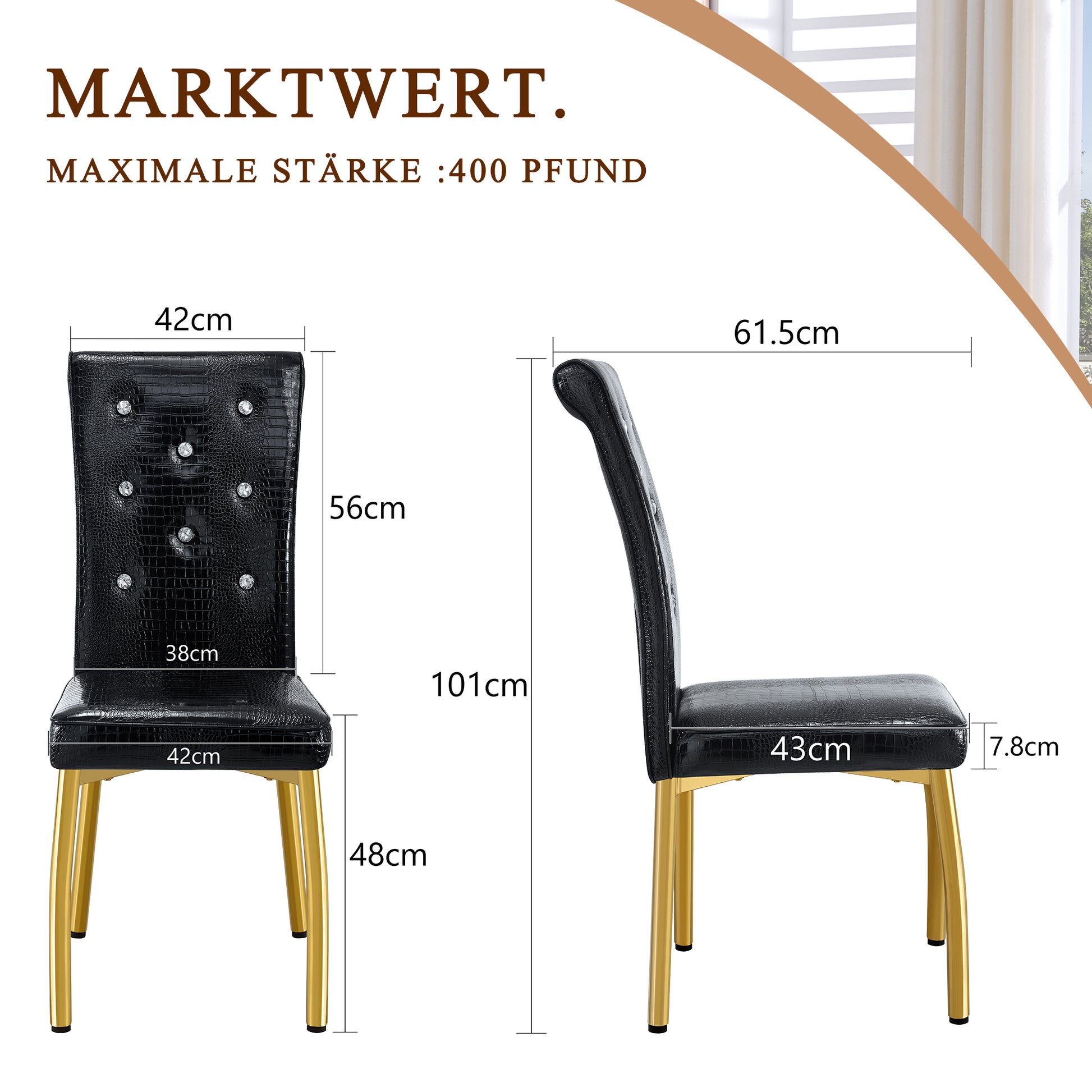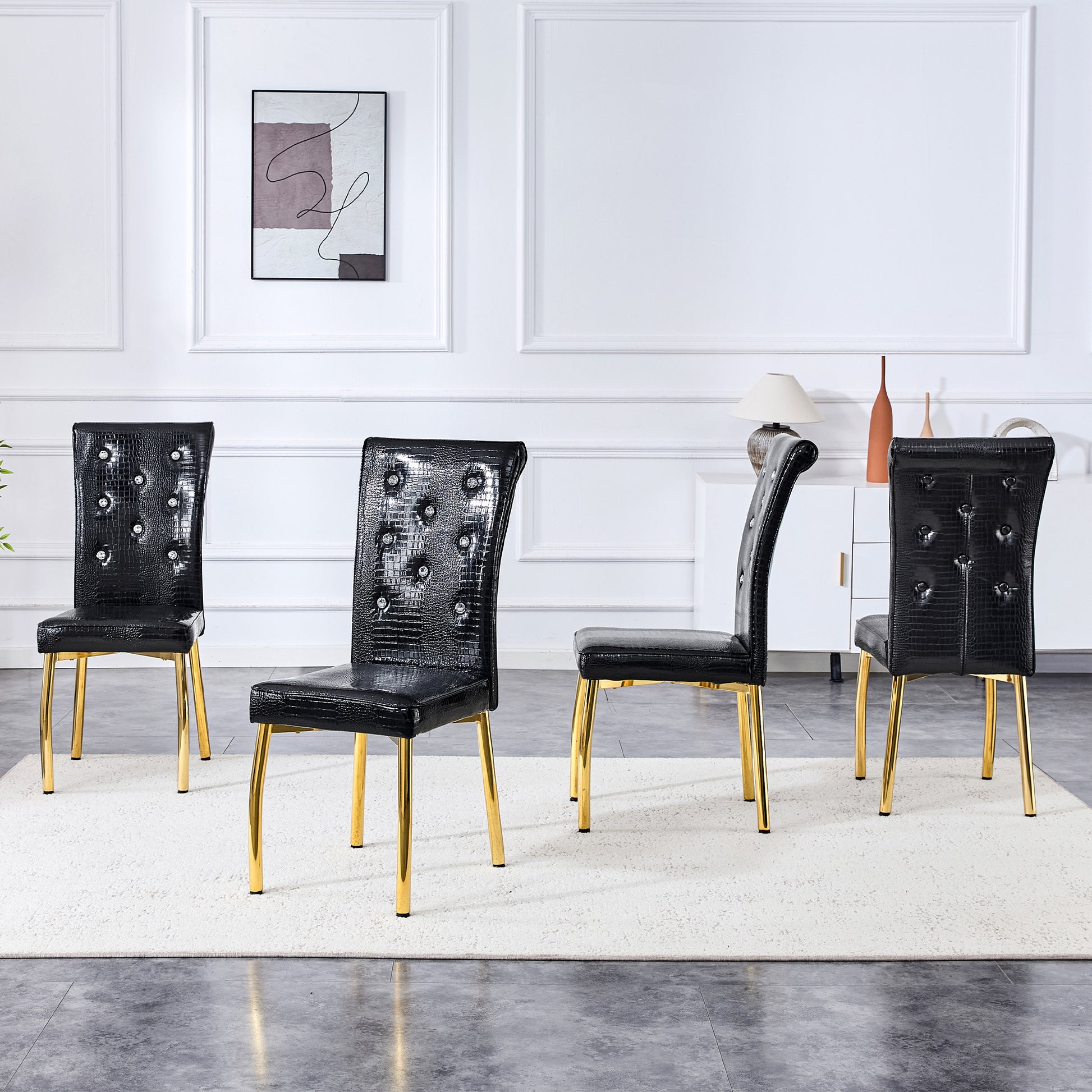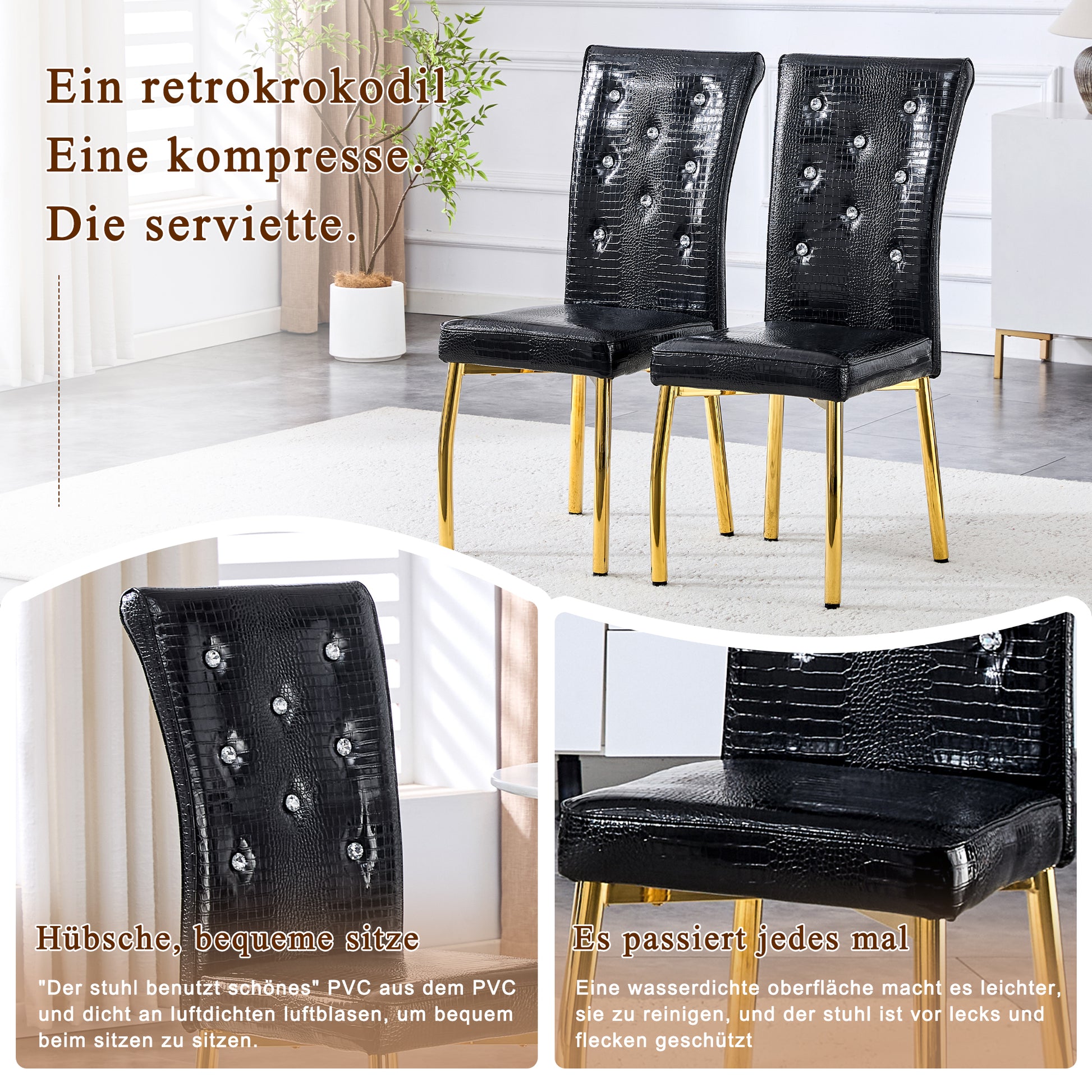 Dining Chairs, Set of 2 Retro Alligator-Skin Upholstered with Crystal Buckle Design, Gold-Plated Metal Legs, Faux Leather