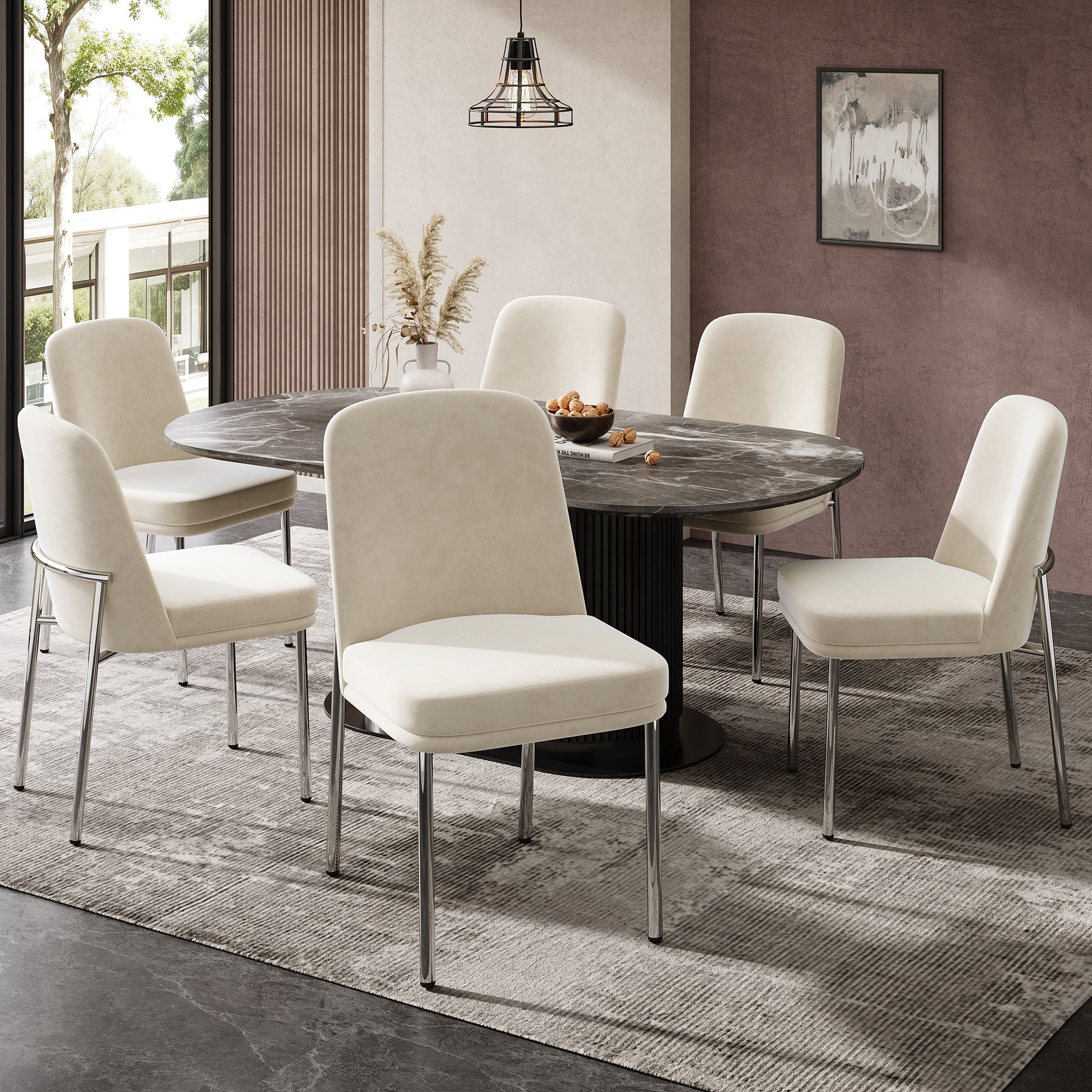 Dining Chairs, Set of 6, Thick Seat Cushions, Metal Legs, Beige Velvet