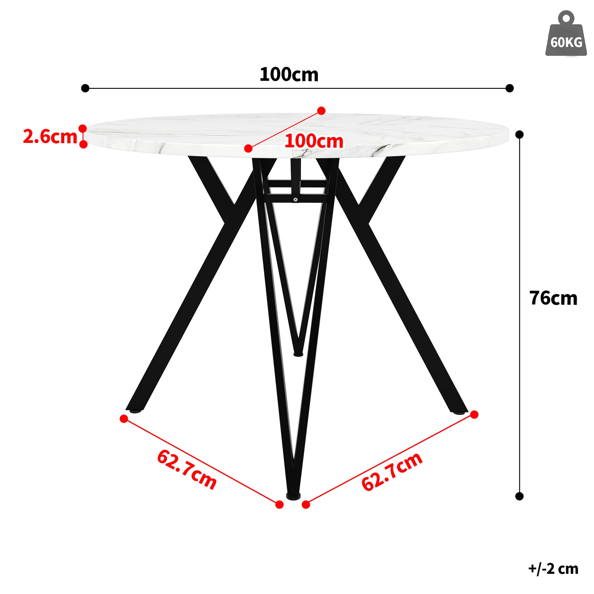 Dining Set 5-Piece Round 100cm Marble Top Black Metal Legs Grey Linen