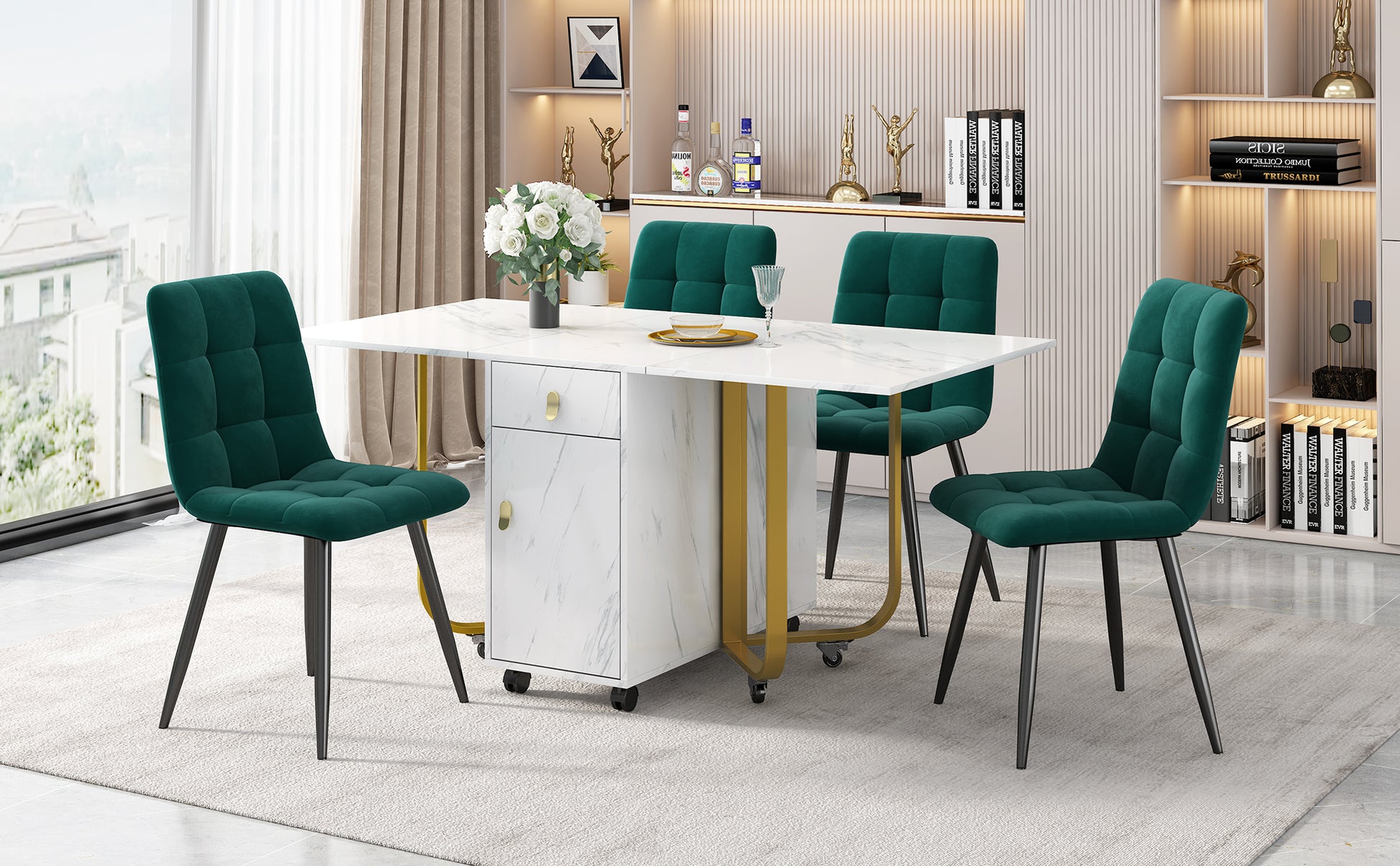 Dining Set, Folding 150cm Table & 4 Velvet Chairs, White MDF/Black Legs
